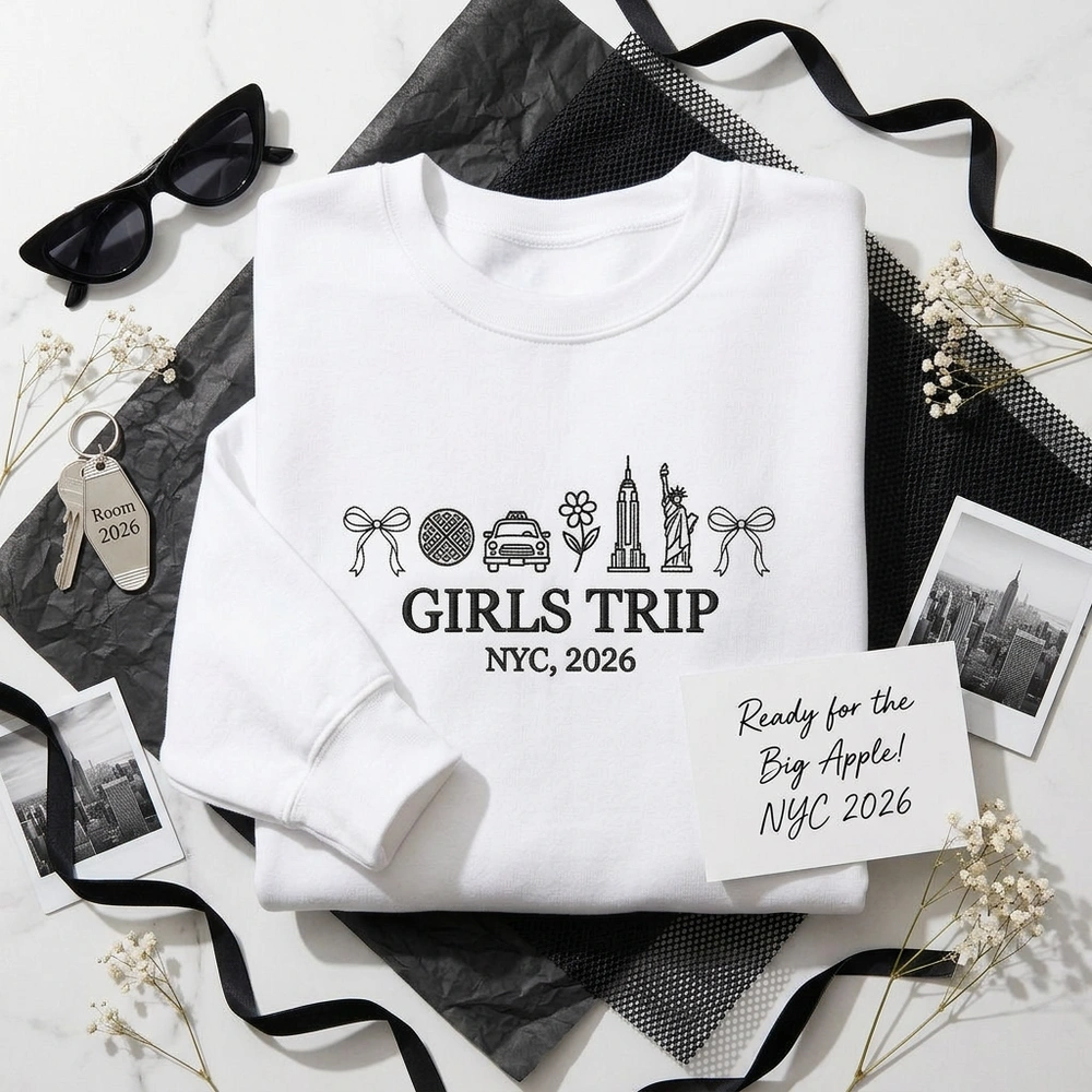 The NYC Girls Trip 2026 Embroidered Sweatshirt is a premium machine-stitched top featuring retro sci-fi icons and classic New York City landmarks—the ultimate group keepsake.