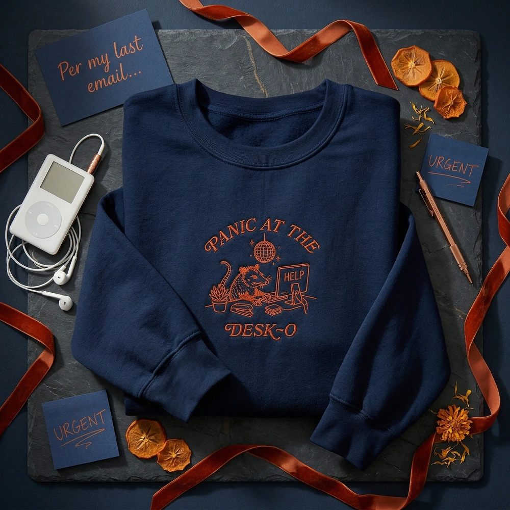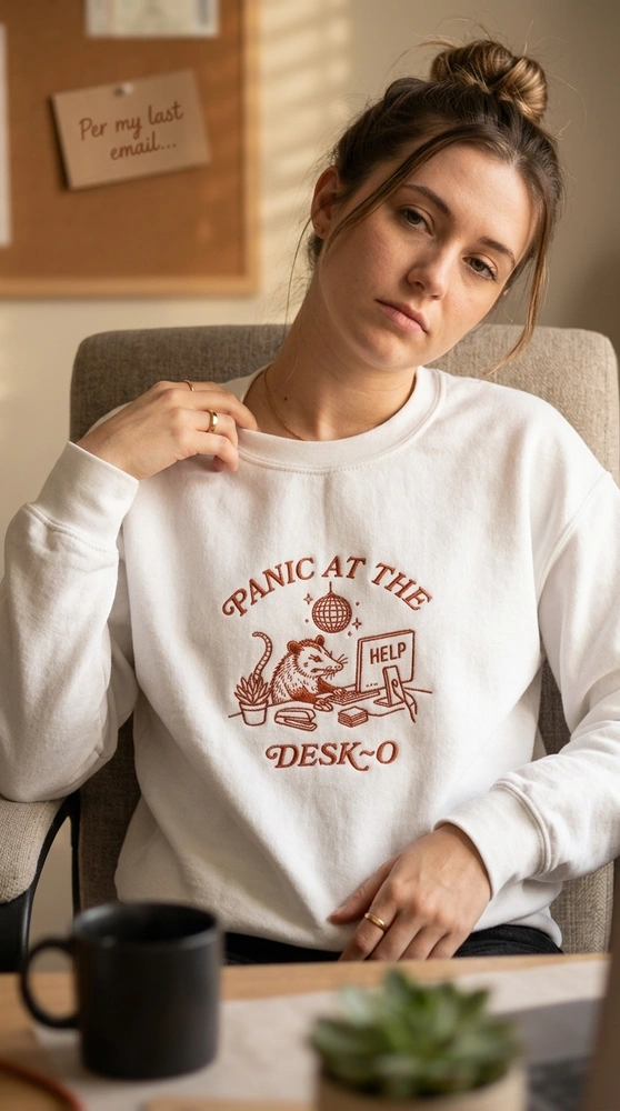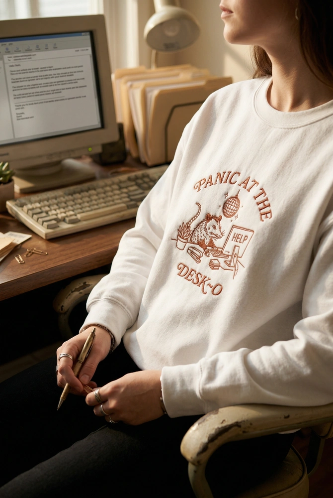 The Opossum Embroidered Sweatshirt is a premium machine-embroidered garment featuring a stressed trash panda at a desk—the ultimate funny office gift.