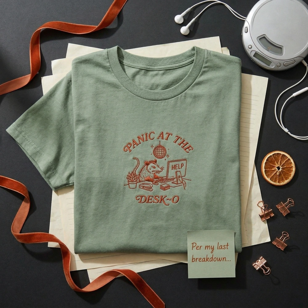 This design is a humorous pun inspired by a beloved 2000s pop-rock band and the “trash panda” internet aesthetic. It perfectly captures the feeling of work-day anxiety with a nostalgic, shareable twist.