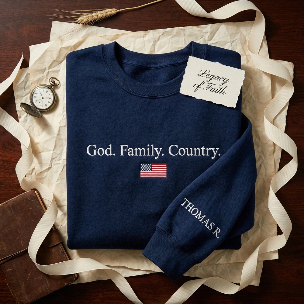 This Patriotic Embroidered Sweatshirt features a premium ‘God. Family. Country.’ design with a minimalist American flag. Personalize the sleeve for a unique gift.