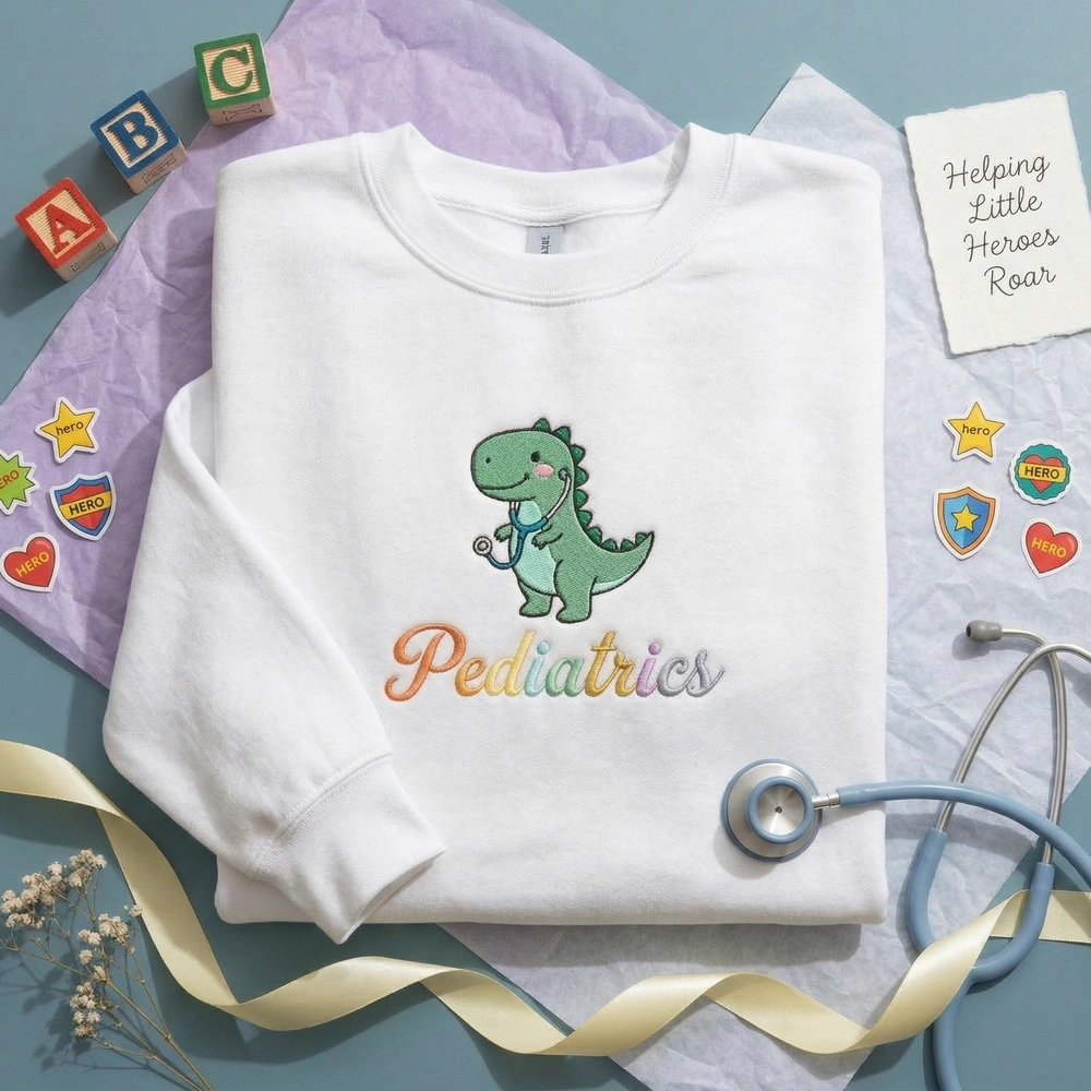 The pediatric nurse gift is a premium machine-embroidered sweatshirt featuring a friendly dinosaur doctor—the ultimate comfort for pediatric wards.