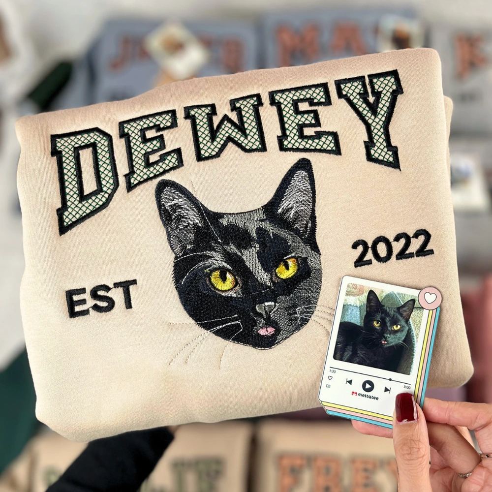 Turn your favorite photo into a custom cat sweatshirt. This beautifully embroidered cat portrait is the ultimate personalized gift for pet parents.