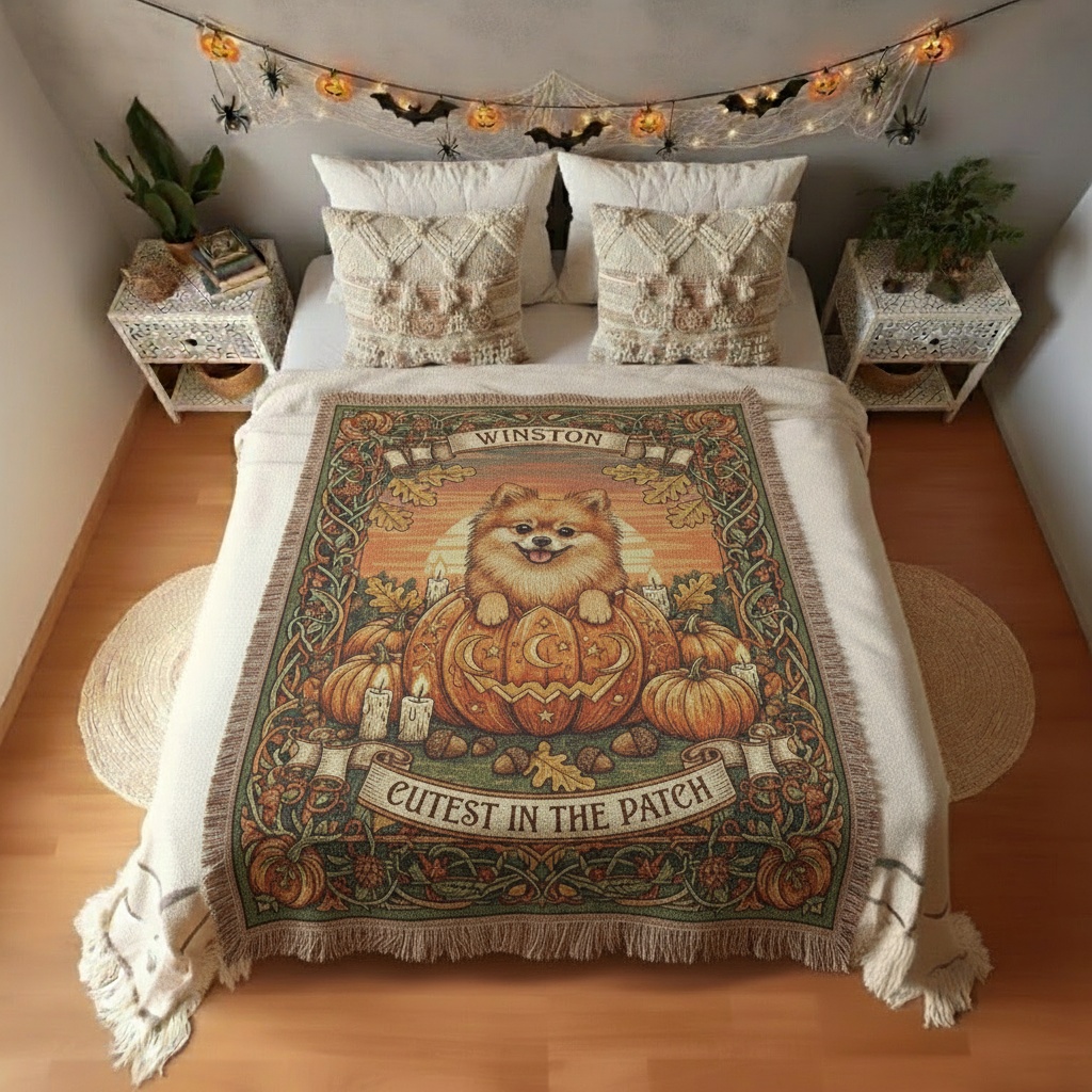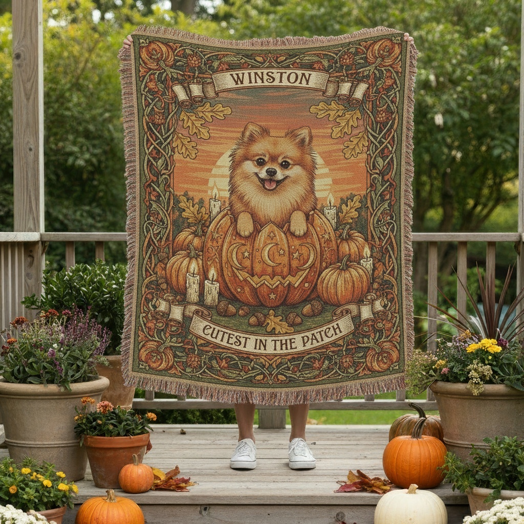 The design features a joyful Pomeranian sitting inside a carved pumpkin, surrounded by glowing candles, autumn leaves, and a rich harvest palette. Personalized with your pet’s name at the top, this blanket makes your furry friend the star of the fall season — whether you’re decorating your living room or snuggling up on a crisp evening.