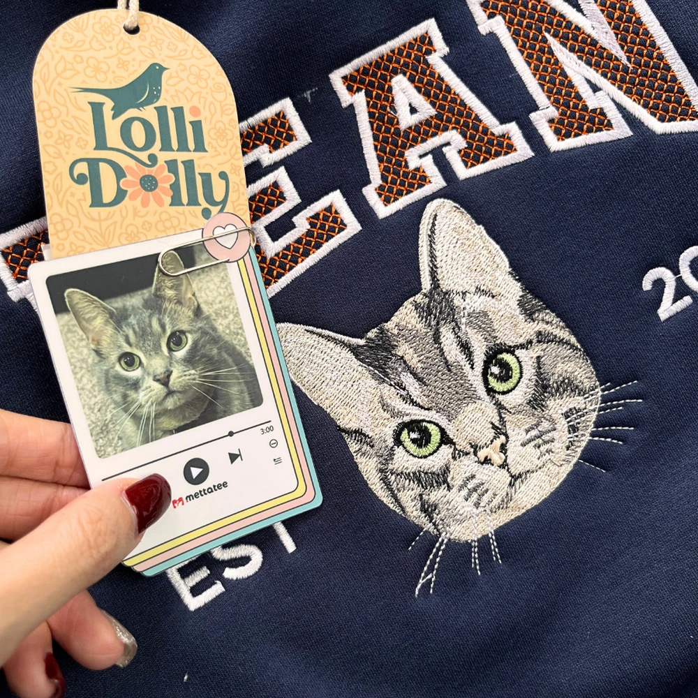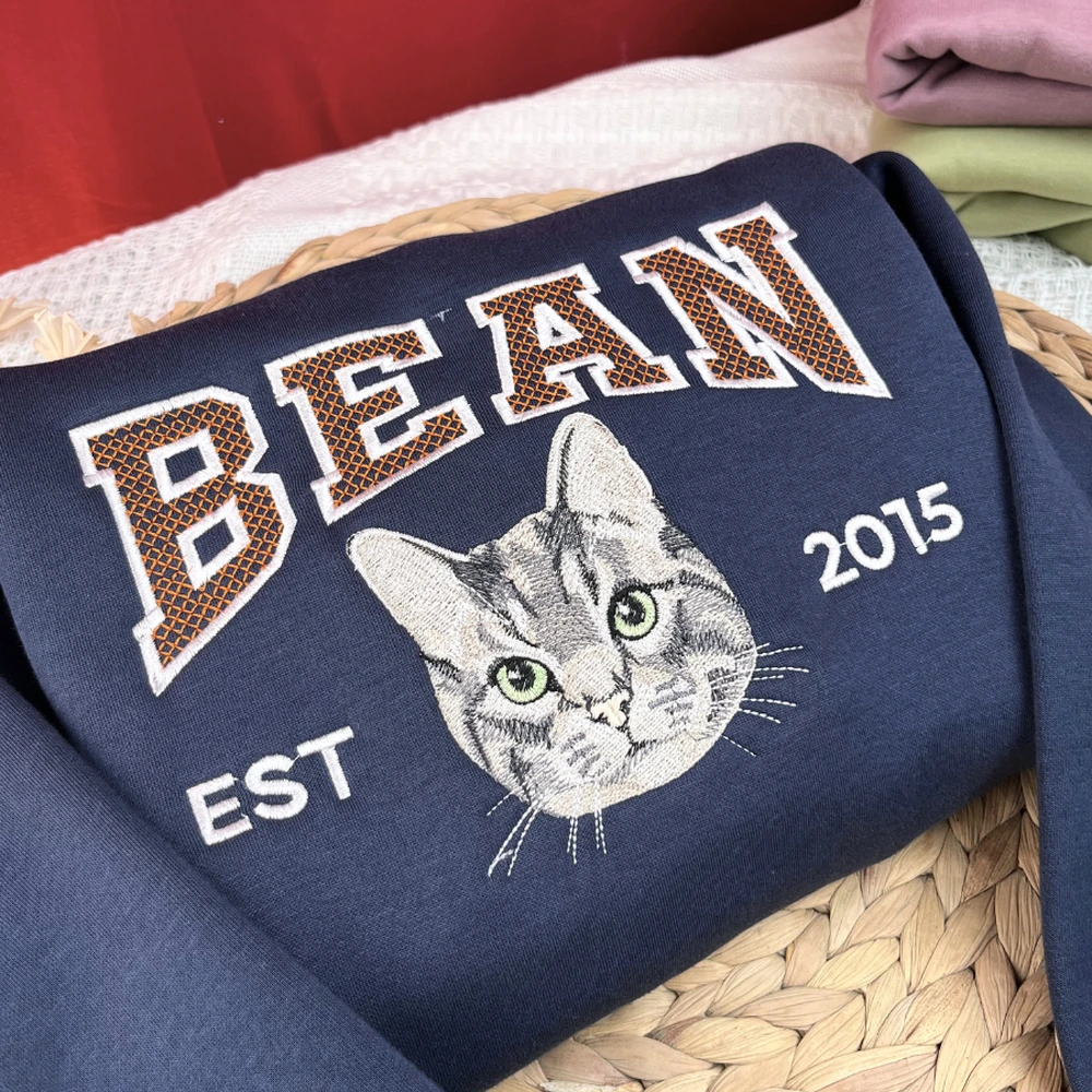Personalized Portrait from Photo – Simply send us your cat’s photo, and we’ll create a beautiful embroidered portrait with their name.