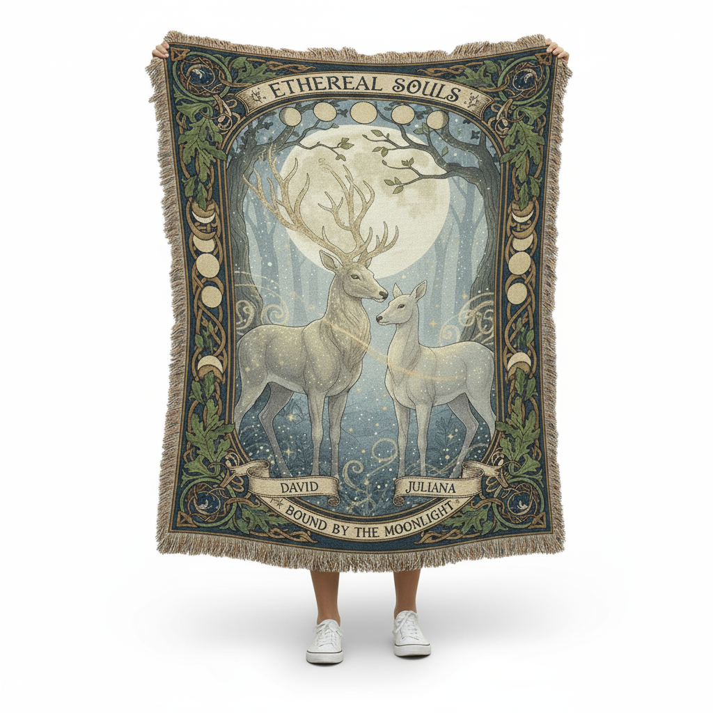 Featuring a majestic stag and doe standing beneath a luminous full moon, framed by intricate moon phase and forest designs, this blanket transforms any space into a romantic and mystical sanctuary. Personalized with your chosen names, it becomes a one-of-a-kind piece that celebrates love — bound by the moonlight.