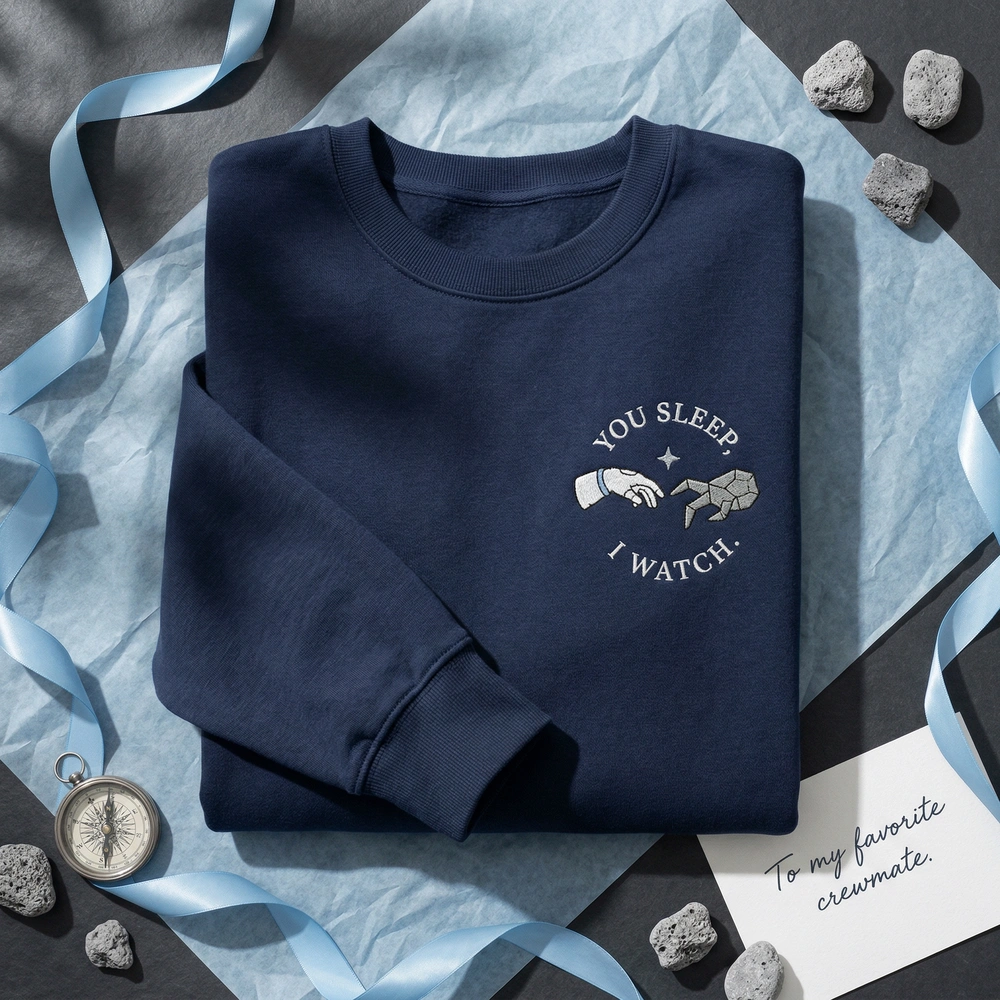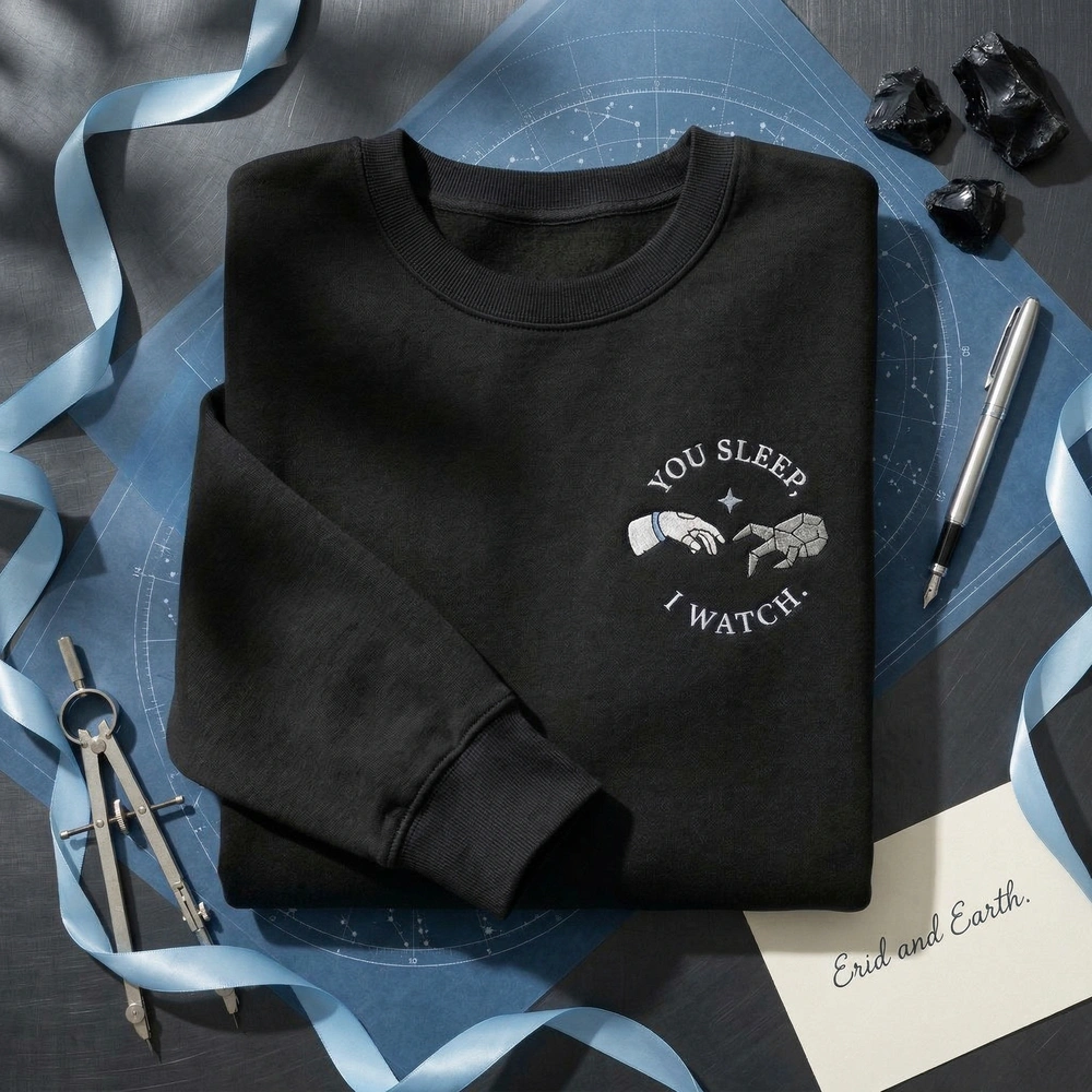 The Project Hail Mary Embroidered Sweatshirt features the “You Sleep I Watch” quote and a minimalist first contact design between Rocky and an astronaut.