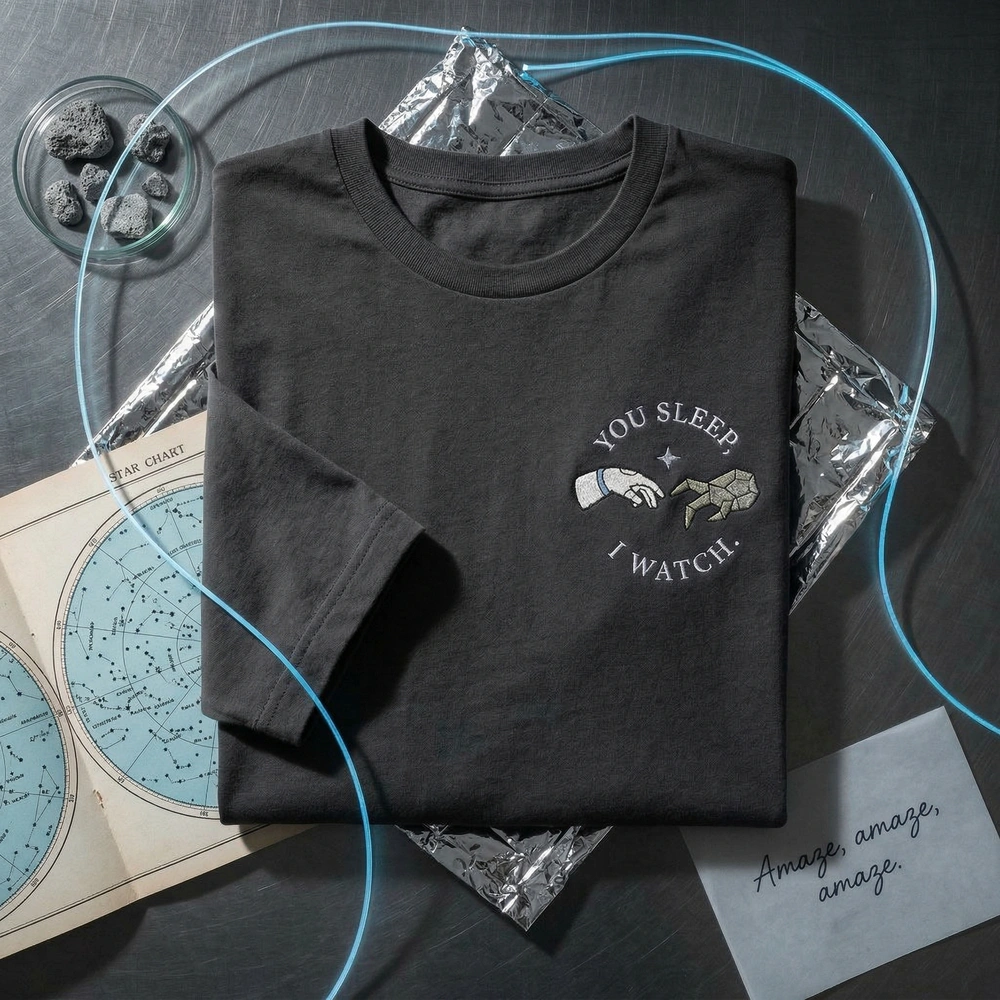 This design is meticulously machine-embroidered on a deep navy garment, providing a high-contrast backdrop for the 10cm x 10cm left-chest motif. The artwork features a “Creation of Adam” style composition with four distinct thread colors: Astronaut White for the human glove, Rocky Grey for the geometric alien claw, Silver Star for the central shimmering point, and Sky Blue accents. The circular motif is framed by the iconic phrase “YOU SLEEP, I WATCH,” rendered in crisp, legible typography that ensures the message resonates with fellow fans.