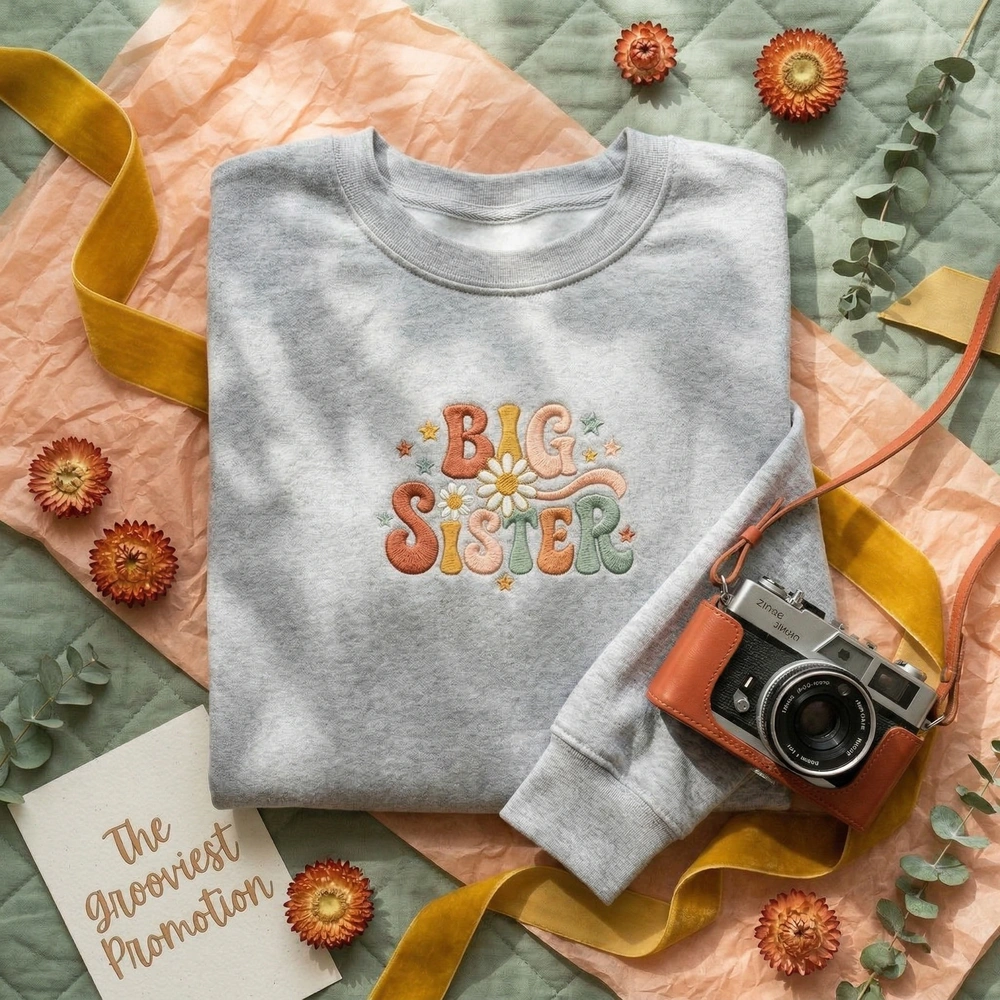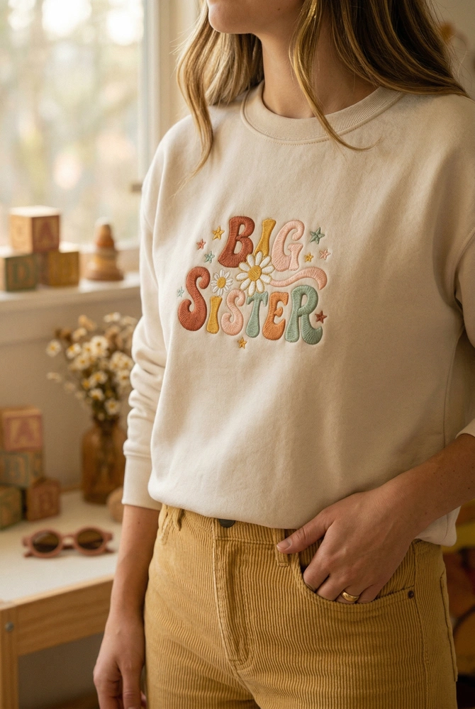 Capture the magic of your family’s next big milestone with this vibrant, nostalgic piece. Whether you’re planning a professional photoshoot or a casual reveal, our groovy sibling shirt brings a burst of warm, 70s-inspired joy to your toddler’s wardrobe. It is more than just a big sister shirt; it’s a keepsake that celebrates their new role with a fun, trendy aesthetic. Browse more embroidered sweatshirts | mama sweatshirt in our collection to coordinate the whole family.