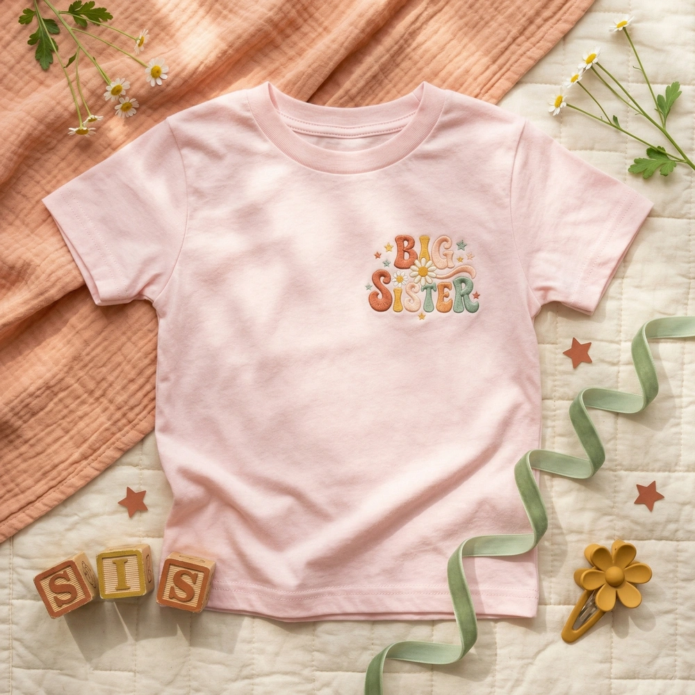 This original design is meticulously machine-embroidered on a premium Natural colored garment, providing a warm, neutral base that makes the colors pop. The embroidery measures 18cm x 12cm and uses four high-quality thread colors: Terracotta, Mustard Yellow, Soft Peach, and Sage Green. The “BIG SISTER” text is rendered in a thick, bubbly wavy font that curves organically, accented by a bright daisy on the ‘i’ and retro four-point sparkle stars scattered around the edges. This high-density stitching ensures the vibrant 70s aesthetic remains crisp and durable through every toddler adventure.