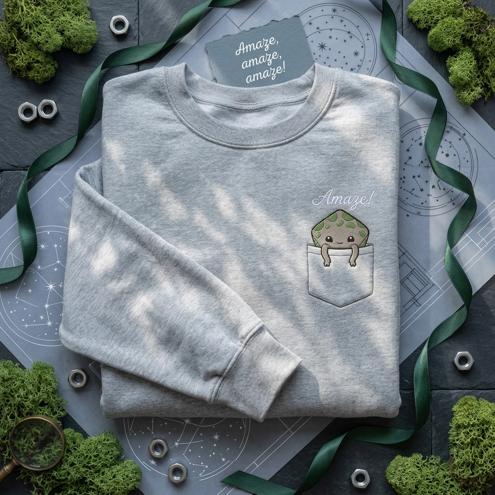 This V2 edition features a meticulously crafted left-chest embroidery of Rocky the alien. The design showcases the top half of the character “peeking” out from an imaginary pocket line. We use a complex fill stitch in a sophisticated grayish-brown (#8B8378) to represent his rough carapace, accented with vibrant green splotches. His signature pentagonal shape and two legs with triangular fingers are perfectly captured in a 10cm x 8cm frame. Above his head, the iconic “Amaze!” catchphrase is embroidered in a crisp white running stitch. The neutral sand garment color provides the perfect canvas for these four distinct thread colors, ensuring the design pops while remaining subtle.