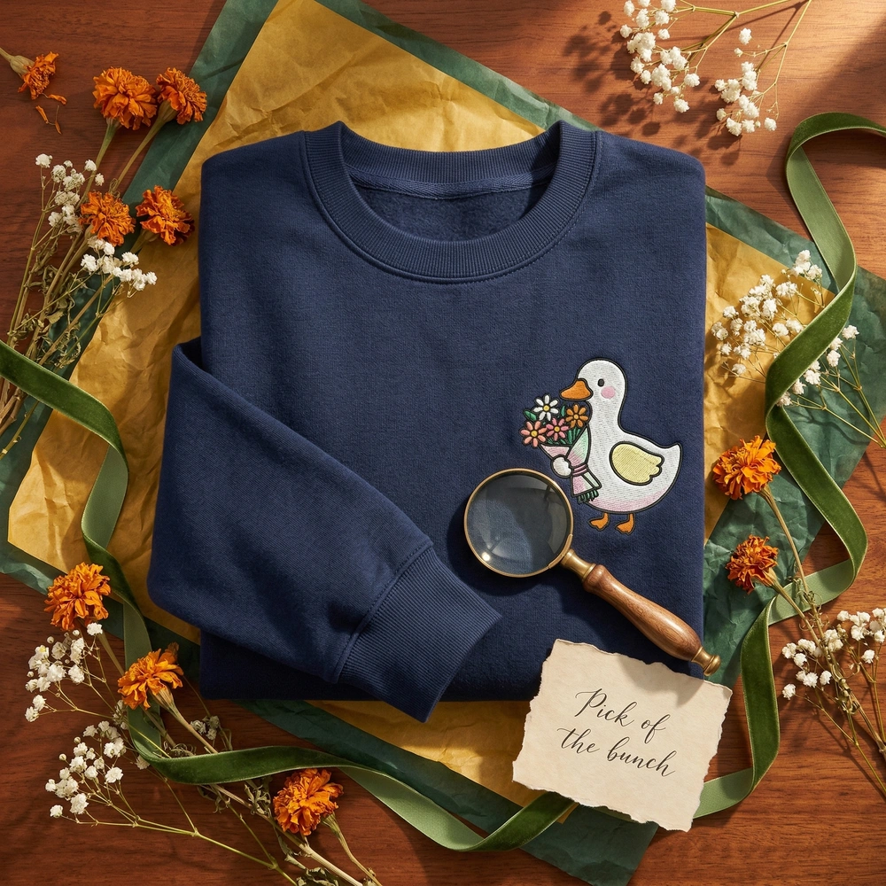The Silly Goose Embroidered Sweatshirt features a whimsical duck with flowers, making it a must-have for cottagecore fans seeking high-quality bird apparel.