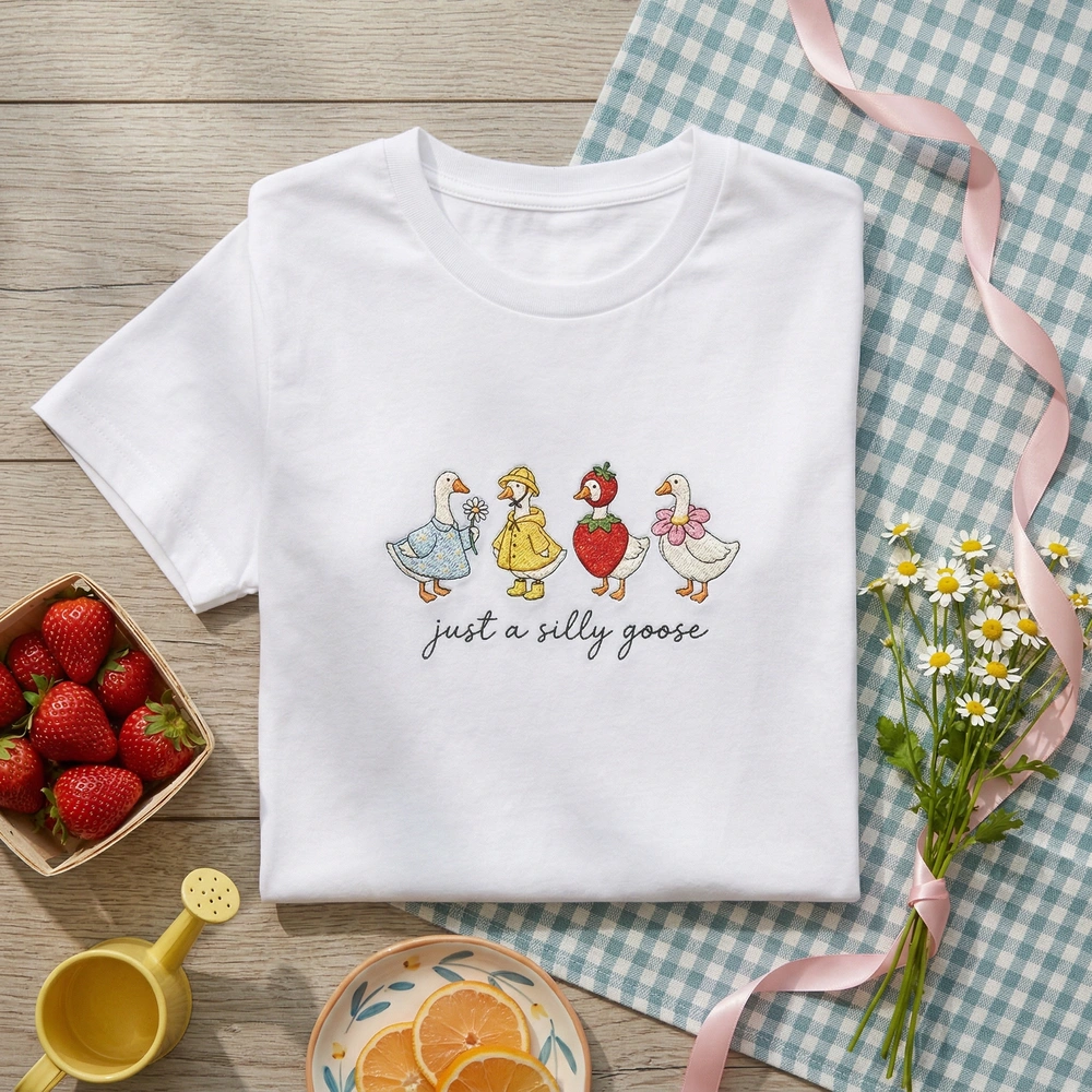 This high-quality embroidery design measures 25cm x 12cm and is expertly rendered across the chest using 8 vibrant thread colors. Set against a beautiful Chambray Light Blue garment, the design features four distinct white geese: one in a light blue floral dress and straw hat, one in a classic yellow raincoat, one in a bright strawberry costume, and one wearing a pink flower petal collar. The phrase “just a silly goose” is delicately stitched in a playful black cursive font below the geese, creating a masterpiece of quirky apparel.