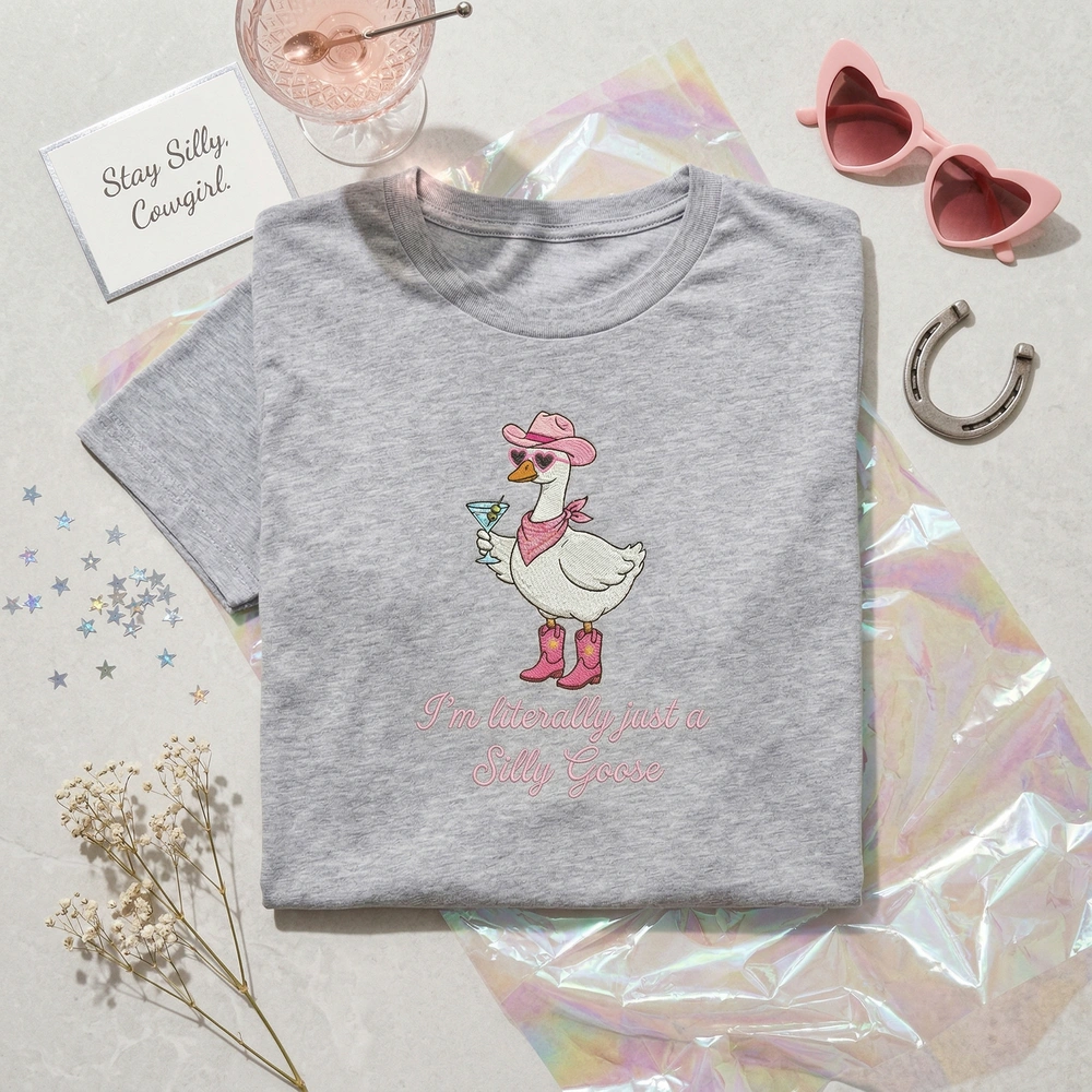 This exclusive embroidery design measures approximately 15cm x 18cm, making it a bold centerpiece on our Light Pink garment. The artwork features a white goose sporting a vibrant pink cowboy hat with white decorative stitching, heart-shaped sunglasses, and pink cowboy boots detailed with yellow stars. Holding a martini glass with a lime green olive, the character is underlined by the playful cursive text, “I’m literally just a Silly Goose.” We use 6 high-quality thread colors (White, Light Pink, Deep Pink, Dark Orange, Lime Green, and Black) and professional-grade fill stitches to ensure the design remains crisp and vibrant after every wash.