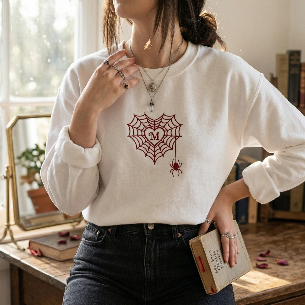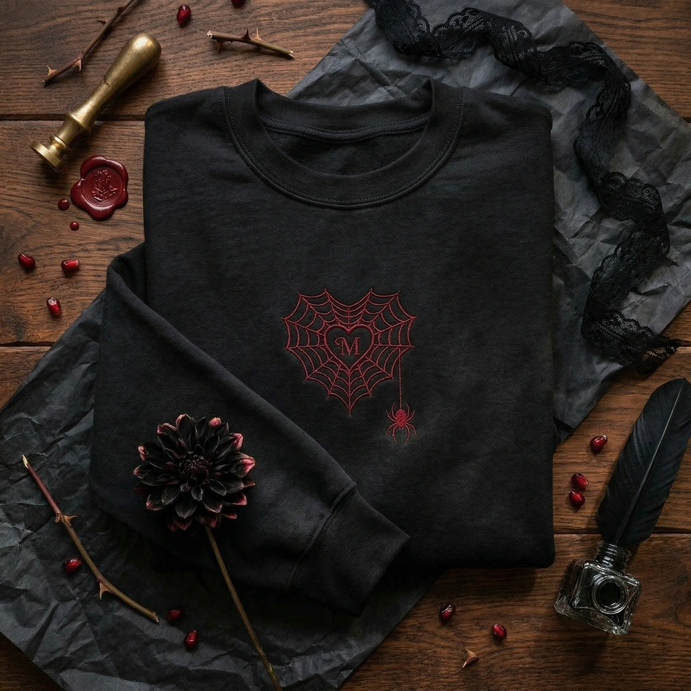The Spiderweb Heart Embroidered Sweatshirt features a dark romantic heart-shaped web with your custom initial – the perfect gothic Valentine’s gift for alternative couples.
