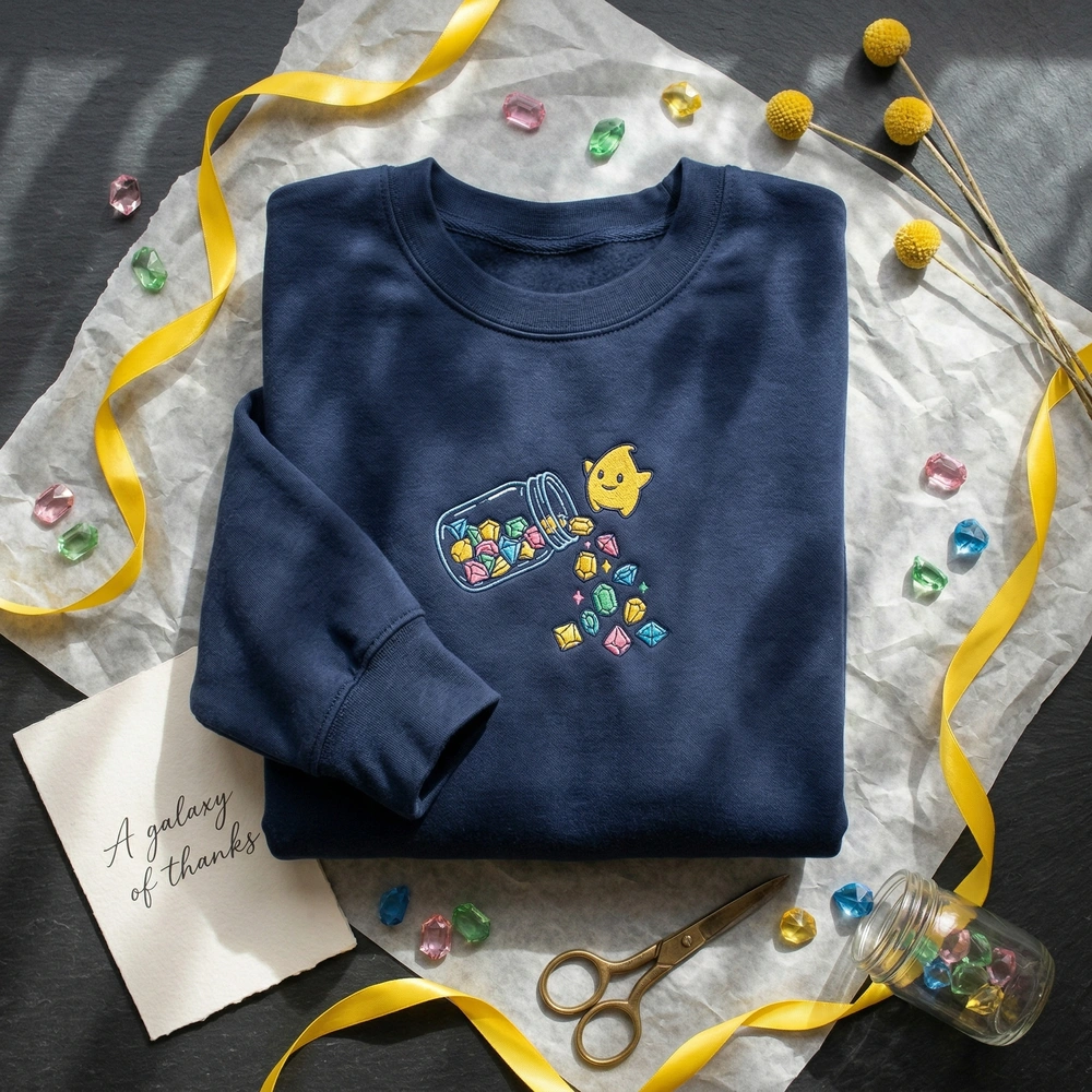 Relive the magic of the cosmos with this high-quality piece of video game apparel. Designed for the nostalgic gamer who grew up navigating gravity-defying platforms, this design captures the satisfying feeling of collecting star bits while listening to a soothing space waltz. Whether you are gearing up for the next console release or just want to showcase your love for the Wii era, this cozy top is a must-have. Browse more embroidered sweatshirts in our collection to find your next favorite gaming fit.