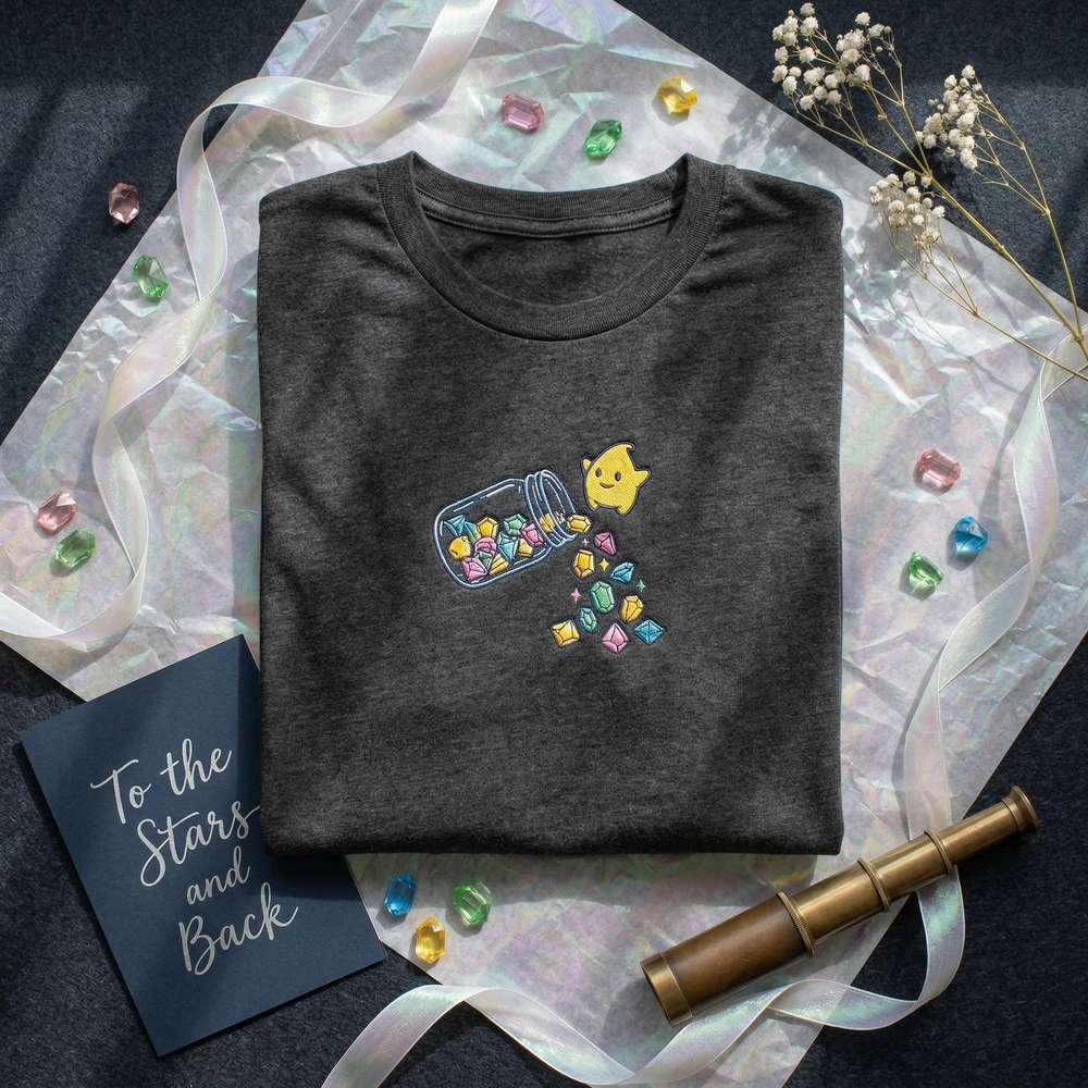 This exclusive design is machine-embroidered on a premium Navy garment, ensuring the colors pop with galactic intensity. The embroidery measures 14cm x 18cm and features five vibrant thread colors: Luma Yellow (#FFD700), Star Pink (#FF69B4), Cosmic Green (#00FF00), Galaxy Blue (#00BFFF), and crisp White. The artwork depicts a tilted mason jar in a bold retro vector style, with a happy Luma reaching out for a spill of faceted, gem-like stars.