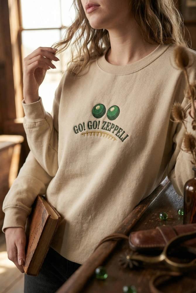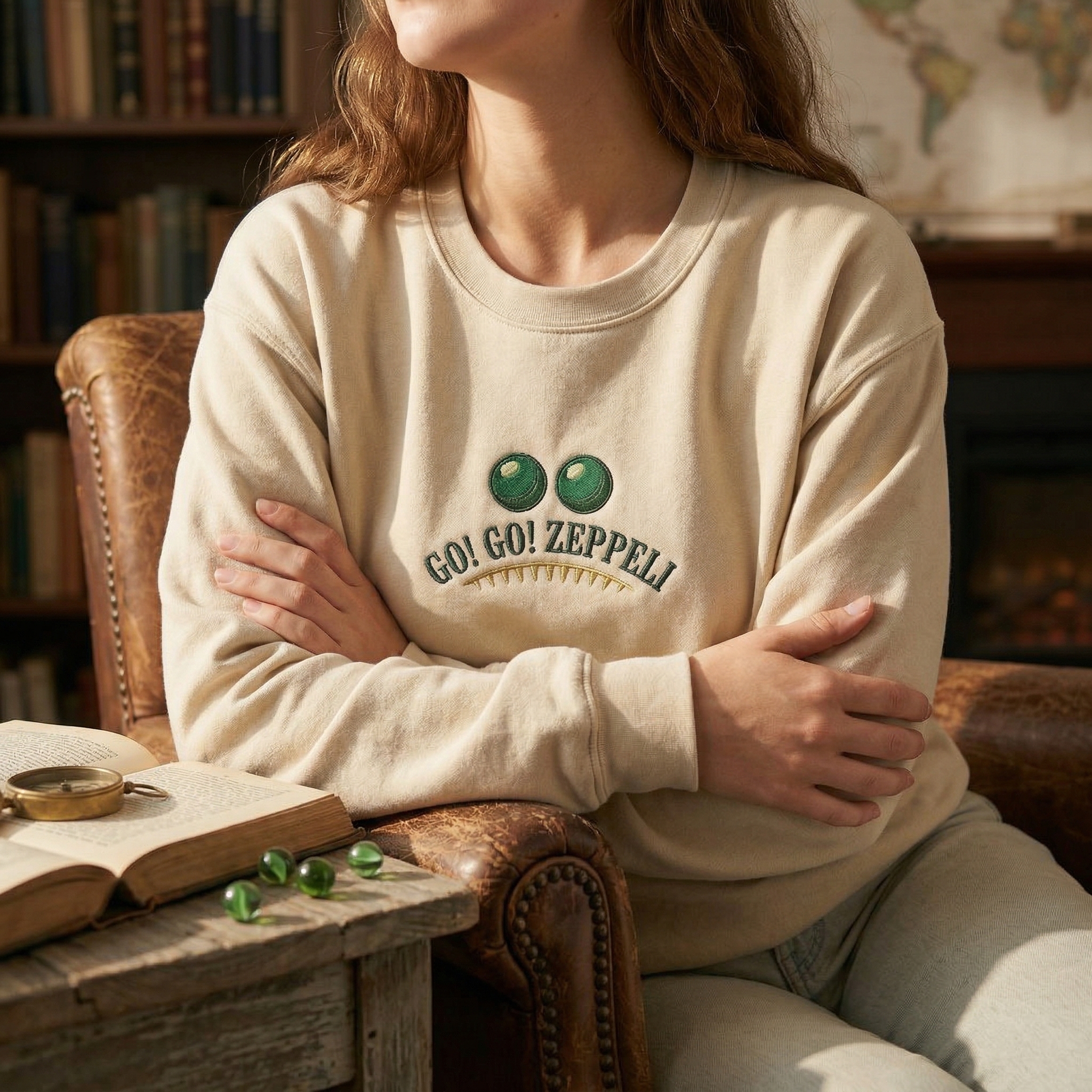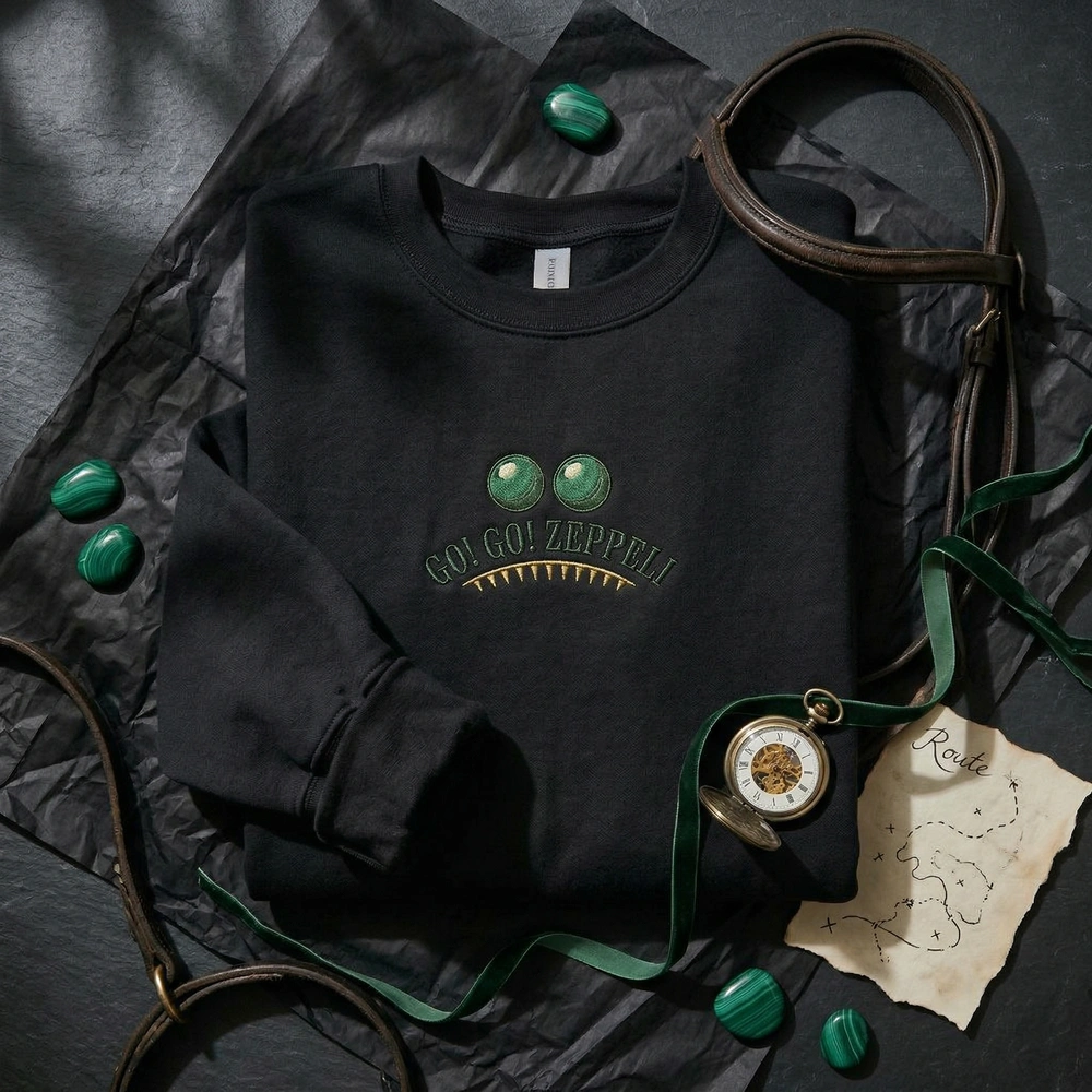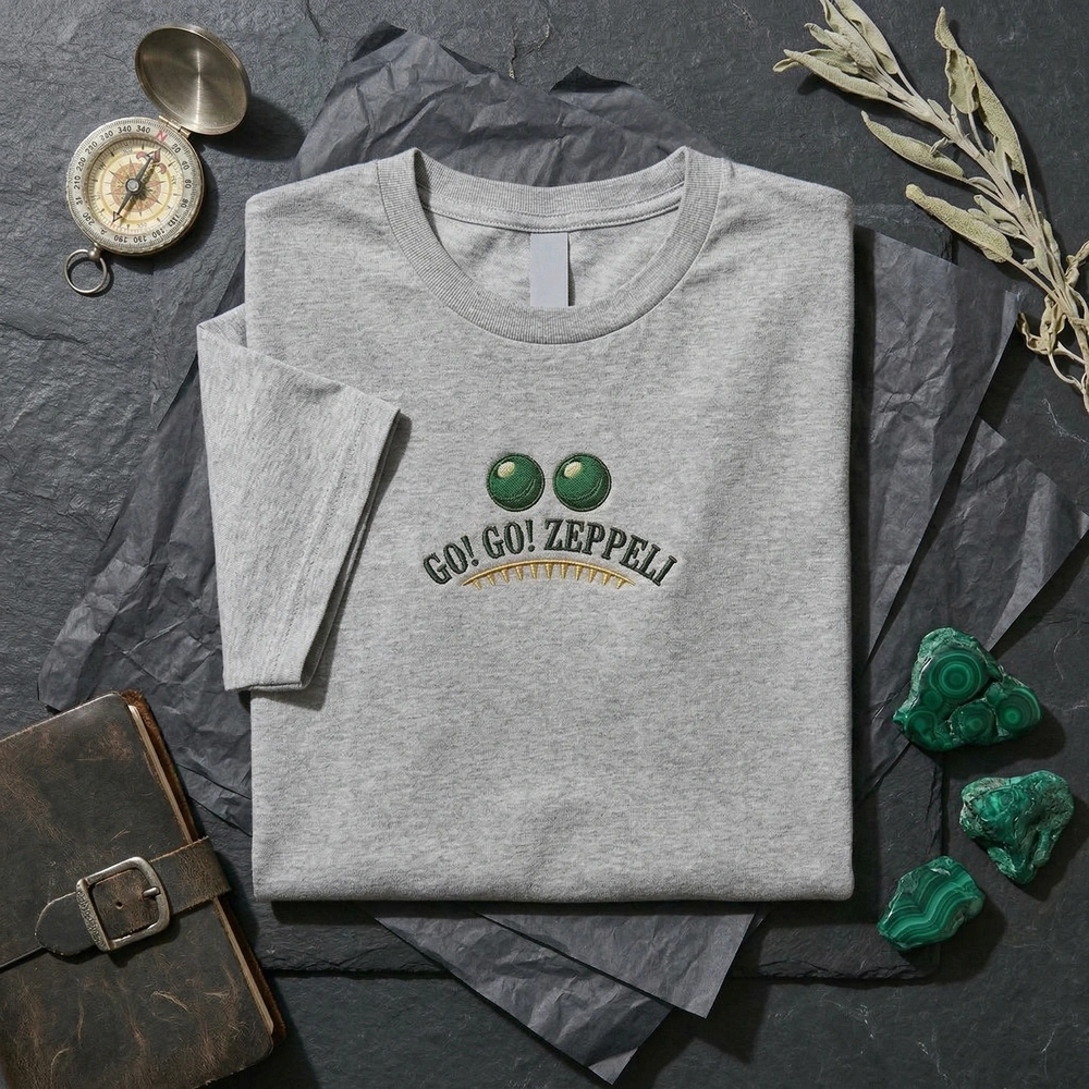 This design is meticulously crafted on a Sand-colored garment to complement the dusty, Western aesthetic of the manga. It features a center-chest placement measuring 15cm x 12cm, utilizing three distinct thread colors. Two glowing green steel spheres are embroidered with a metallic sheen in Forest Green, sitting side-by-side. Above them, the phrase “GO! GO! ZEPPELI” is stitched in a classic Western saloon font, while a subtle row of gold teeth (Gyro’s iconic grill) is embroidered below. This 3-thread color palette of Forest Green, Gold, and Black provides a striking contrast against the neutral sand fabric.
