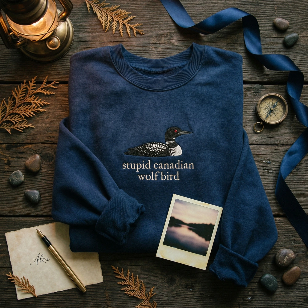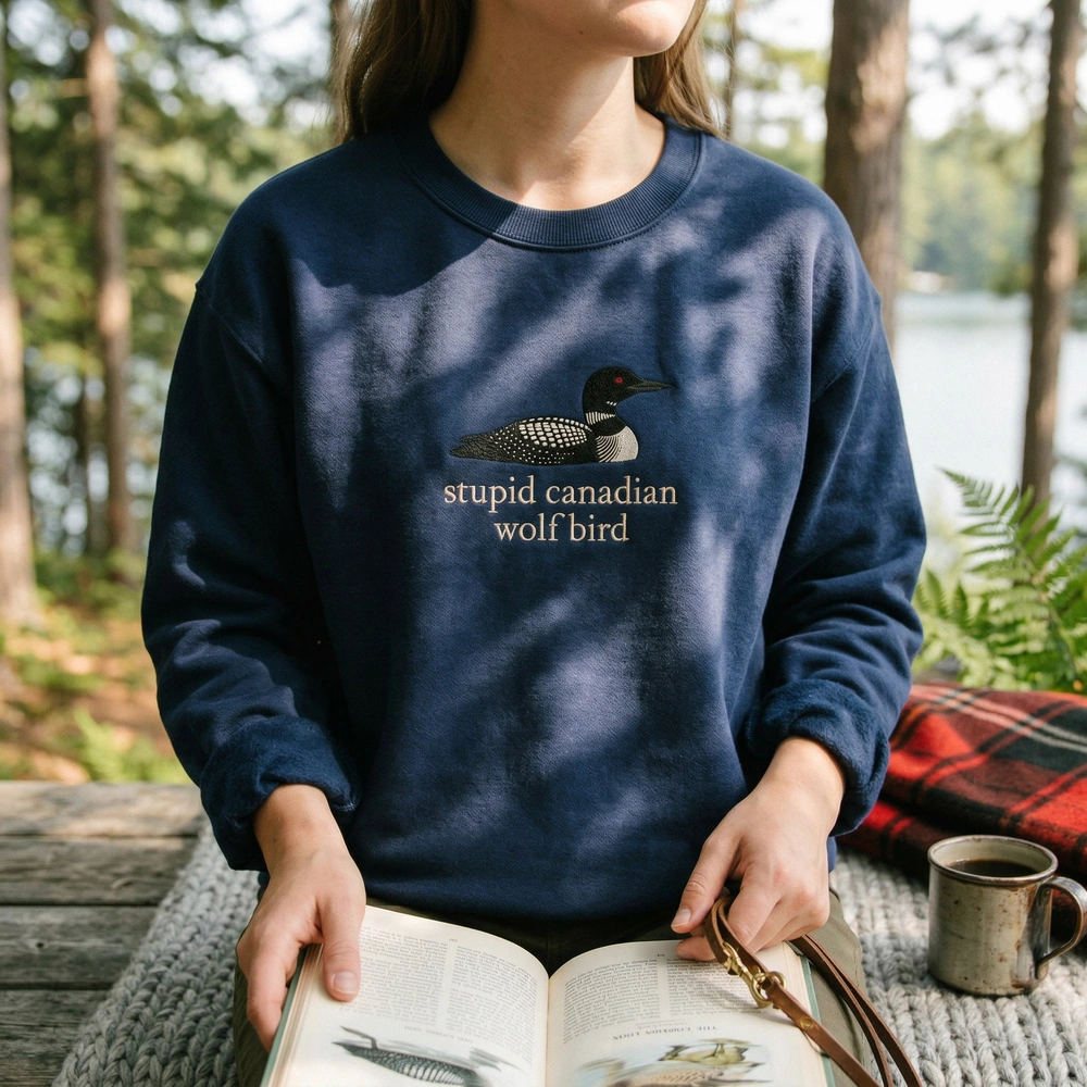 The Stupid Canadian Wolf Bird Embroidered Sweatshirt is a premium navy blue crewneck featuring a detailed loon design for fans of cozy romance stories.