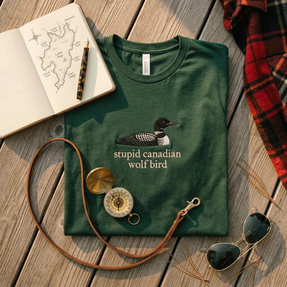 This design is expertly crafted on a high-quality Navy Blue garment. The embroidery measures approximately 15cm x 10cm and utilizes three distinct thread colors: a rich Black, a crisp White, and a striking Red for the loon’s eye. The centerpiece is a meticulously stitched Common Loon, featuring its iconic checkered feather pattern, paired with the phrase “stupid canadian wolf bird” in a clean, lowercase serif font. The high stitch density ensures the design remains vibrant and durable through every wash.