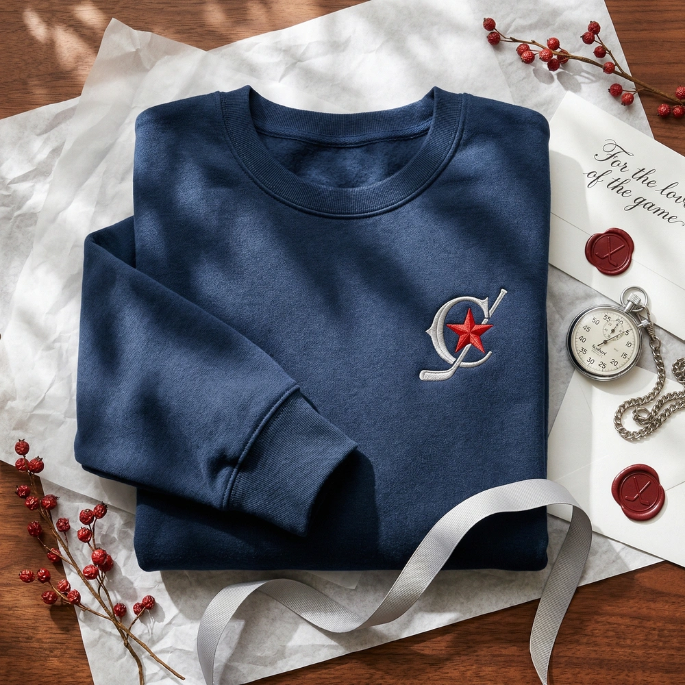 Subtle columbus hockey embroidered sweatshirt featuring a minimalist retro crest with a navy ‘C’, red star, and hockey stick on a premium navy garment.