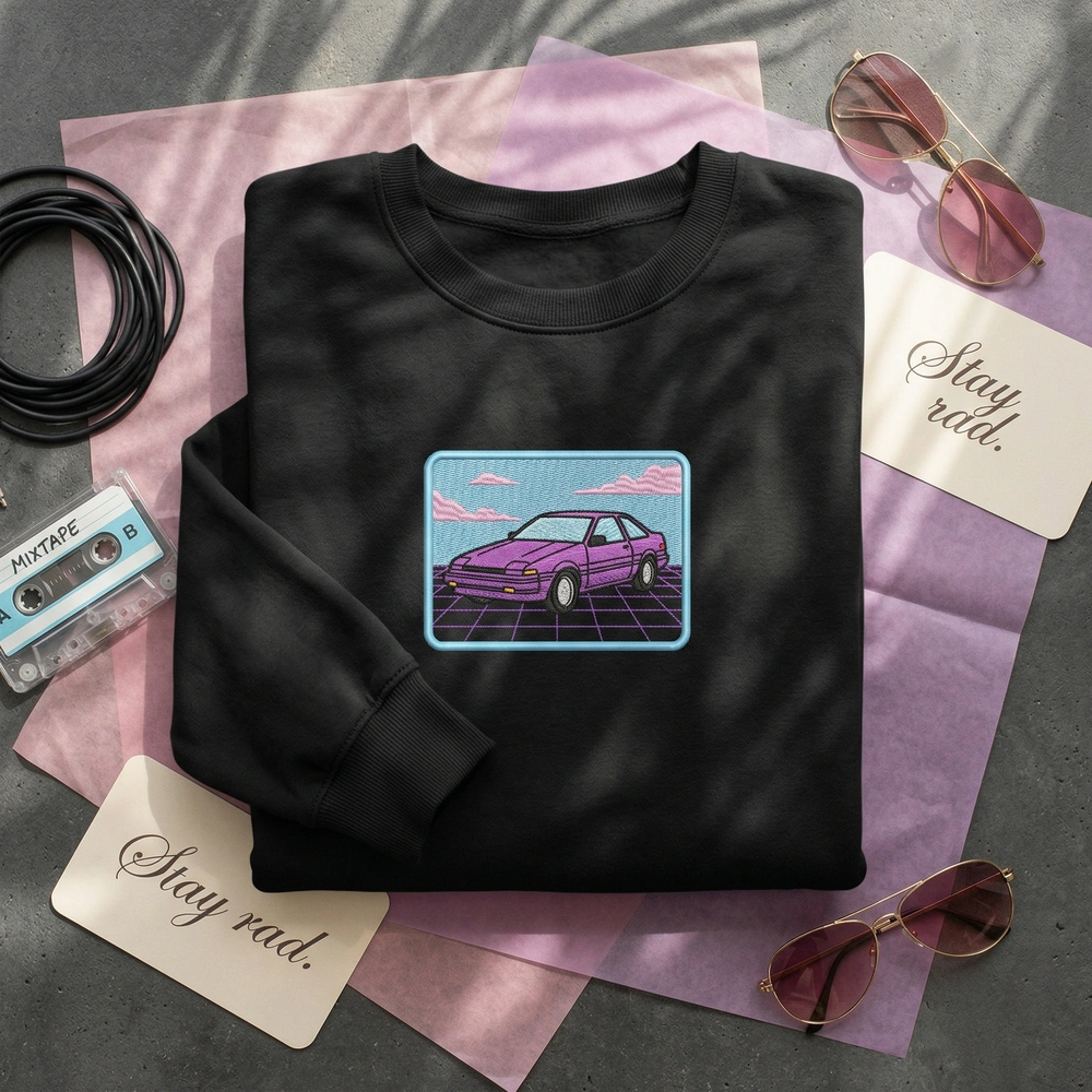 The Synthwave Car Embroidered Sweatshirt is a premium machine-embroidered top featuring a detailed 80s boxy coupe set against a vibrant outrun neon horizon.