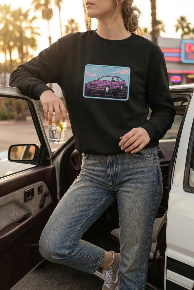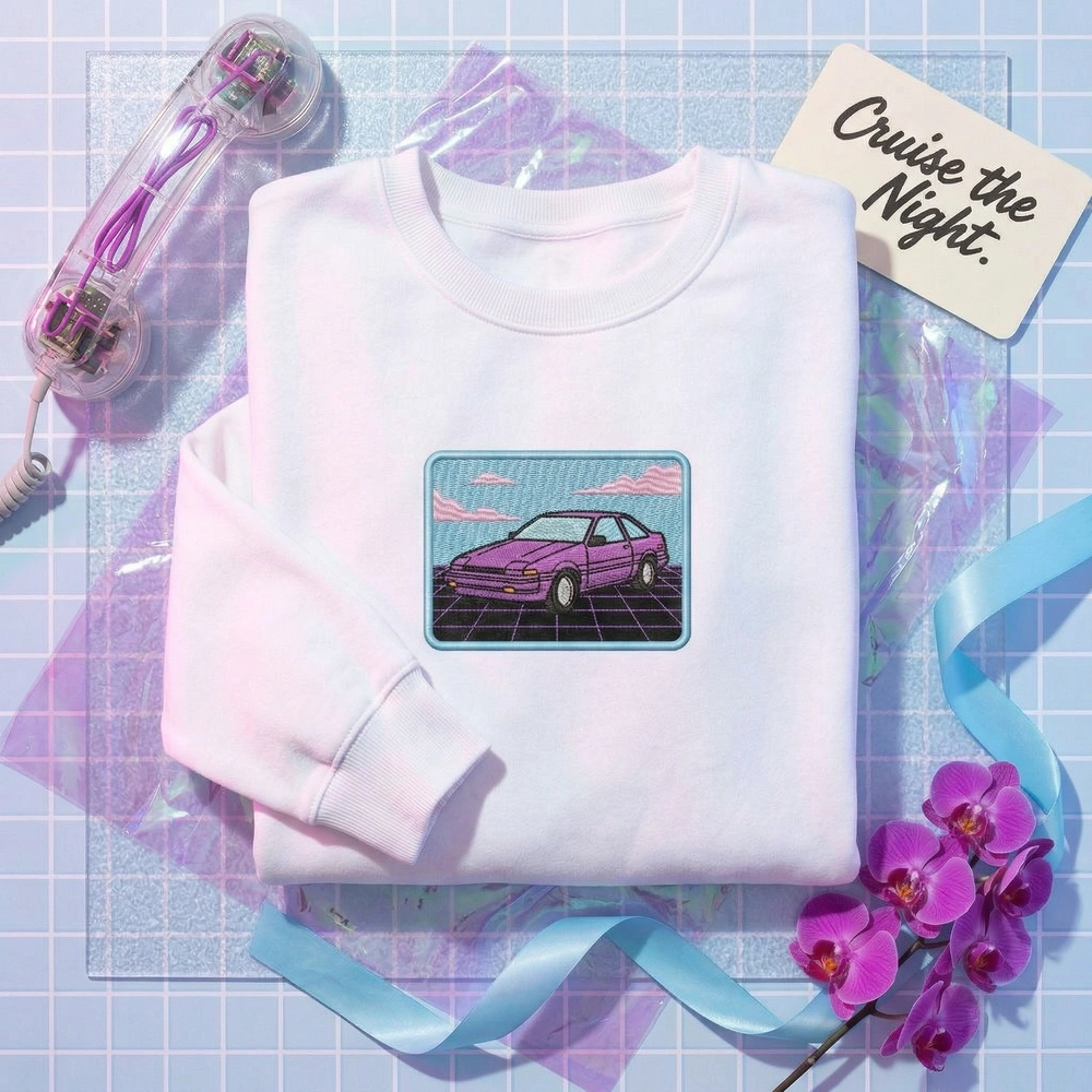 Transport yourself to a neon-soaked digital landscape with this expertly crafted piece of wearable art. Designed for fans of synthwave music and 1980s automotive culture, this sweatshirt captures the high-speed energy of the outrun aesthetic. Whether you are a car enthusiast or a lover of retro-futurism, this garment serves as a tactile tribute to the ‘neon-noir’ era. Browse more embroidered sweatshirts or find your next favorite gaming sweatshirt in our curated collection.