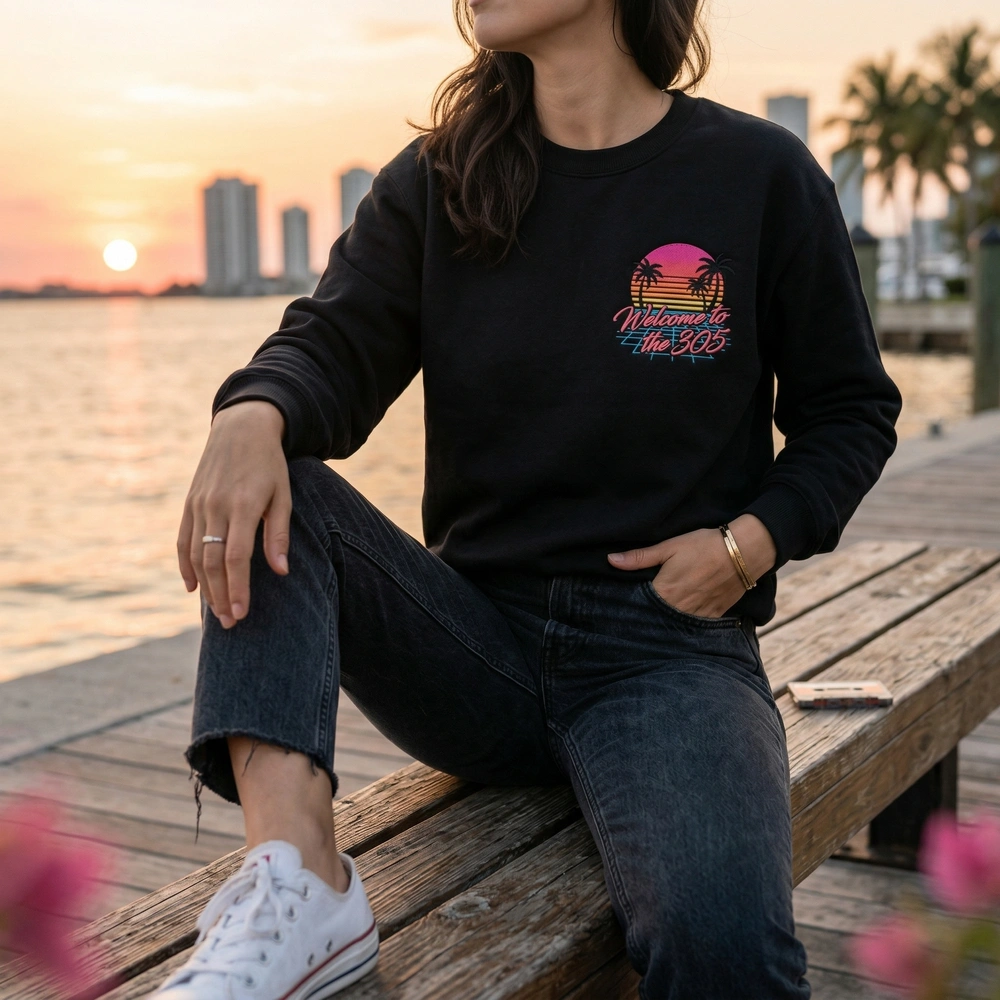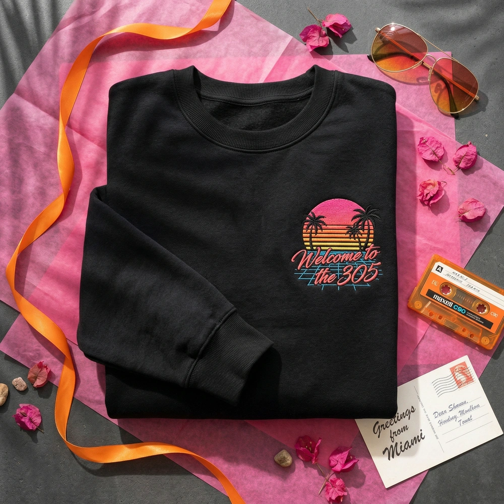 Transport yourself to the neon-soaked streets of a digital paradise with this high-density embroidered piece. Designed for streetwear enthusiasts and hyped gamers anticipating the next big 2026 open-world release, this sweatshirt captures the undeniable energy of the Florida coast. Whether you are chasing the vaporwave aesthetic or looking for the ultimate outrun apparel, this crewneck delivers a nostalgic summer vibe that pops in person and on social media. Browse more embroidered sweatshirts or find your next national park sweatshirt in our full collection.