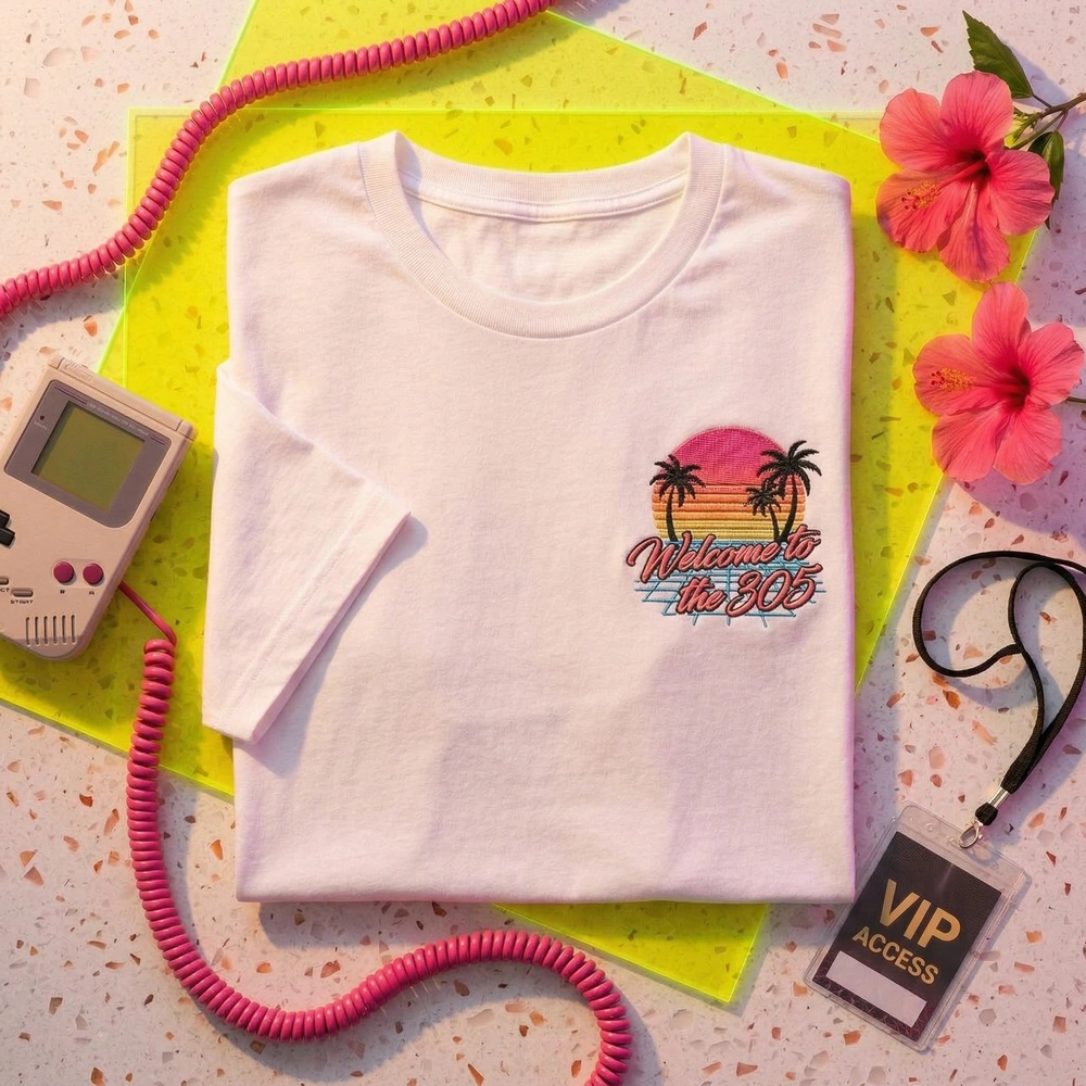 This design is an original creation that blends the classic 1980s Miami aesthetic with modern digital-grid elements. Unlike mass-produced prints, our embroidery provides a 3D texture and durability that lasts for years without fading.
