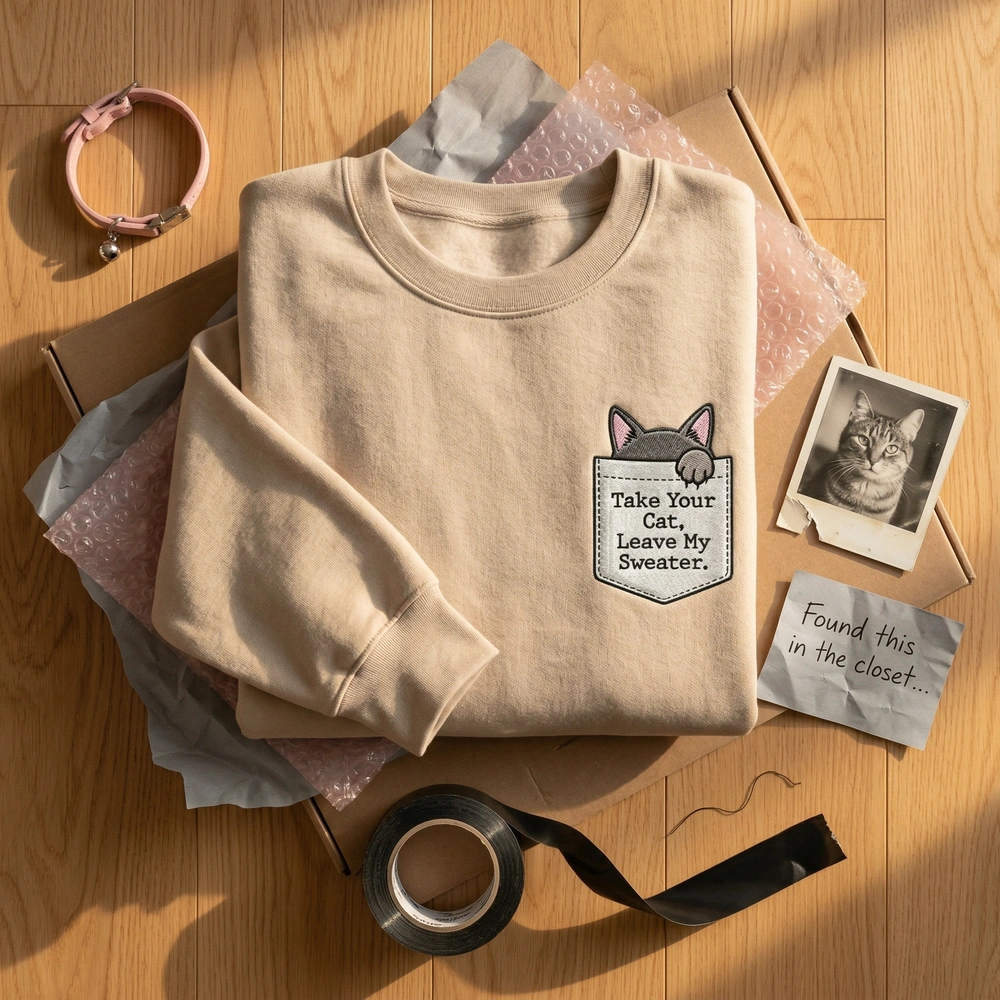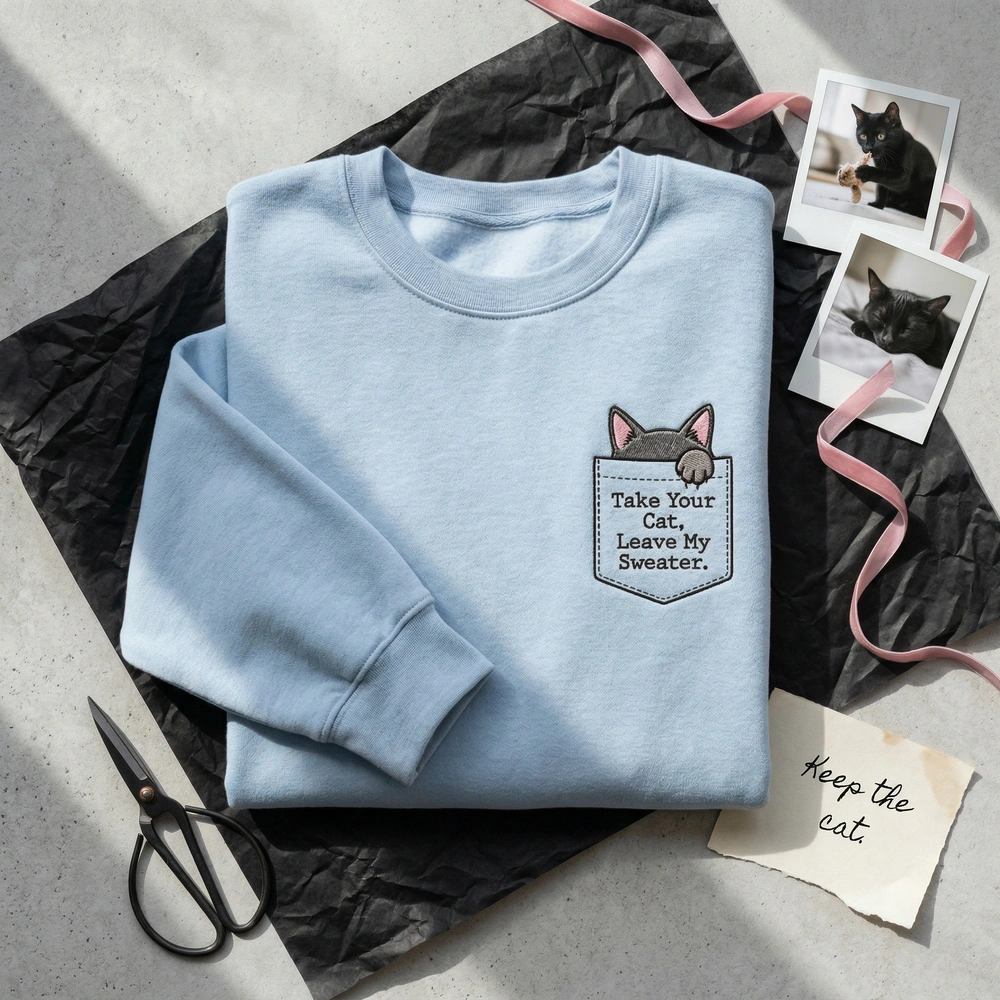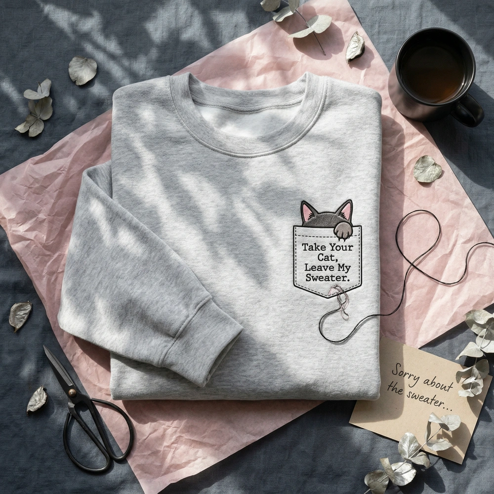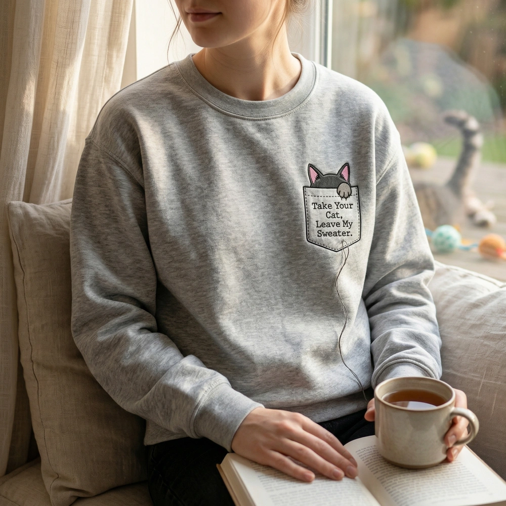 The Take Your Cat, Leave My Sweater Embroidered Sweatshirt is a premium machine-embroidered top featuring a clever pocket cat illusion and sarcastic quote.