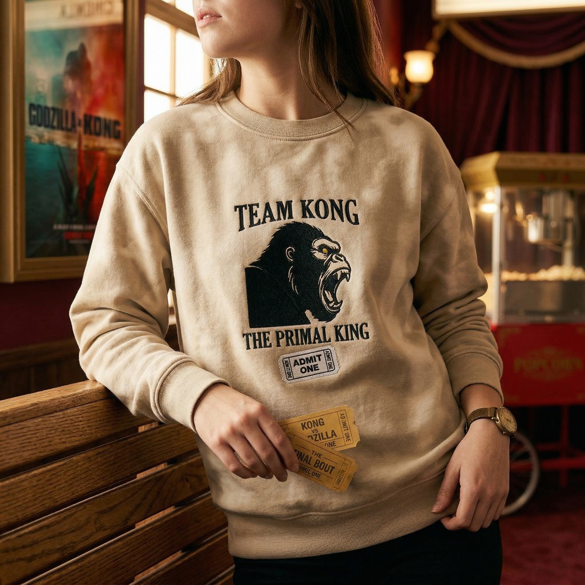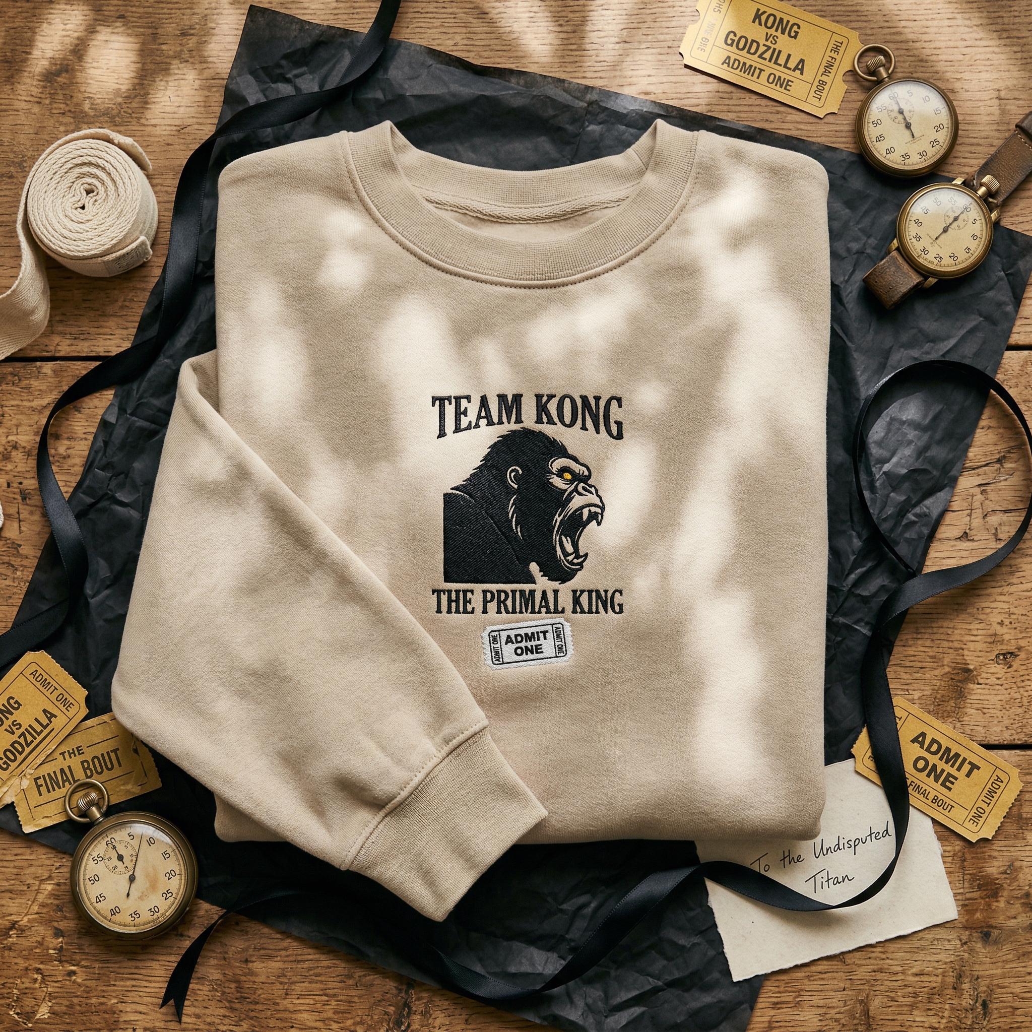 The Team Kong Embroidered Sweatshirt features a vintage monster fight poster design on a heavy sand garment, perfect for fans of the primal king.