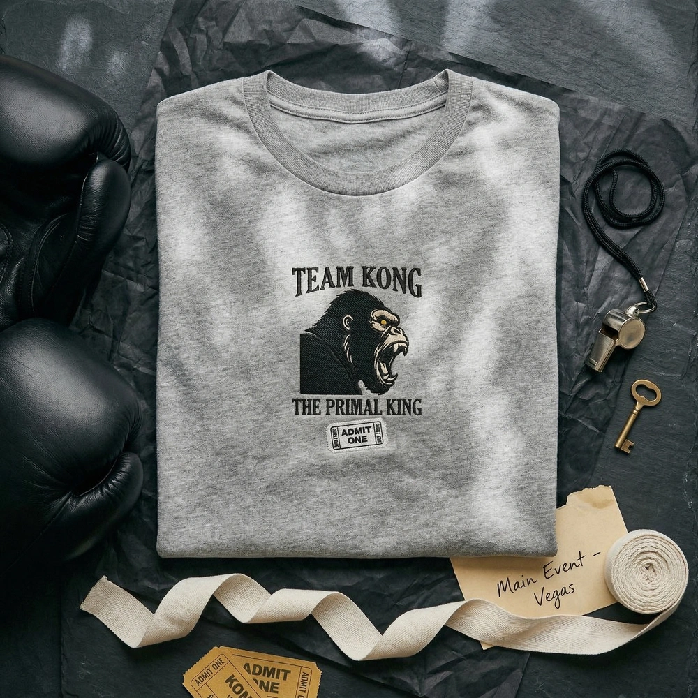 This design is a masterclass in minimalist retro aesthetics, featuring a stark silhouette profile of Kong roaring in heavy black thread. The embroidery measures a substantial 20cm x 25cm, making it a bold statement piece on the sand-colored garment. We use three distinct thread colors: #000000 Black for the silhouette and bold boxing-style typography, #FFFFFF White for the stylized text accents, and a single pop of #FFC000 Golden Yellow for Kong’s piercing eye. The design includes detailed typography reading “TEAM KONG,” “THE PRIMAL KING,” and “UNDISPUTED HEAVYWEIGHT TITAN,” finished with a retro “ADMIT ONE” ticket graphic in the bottom corner.