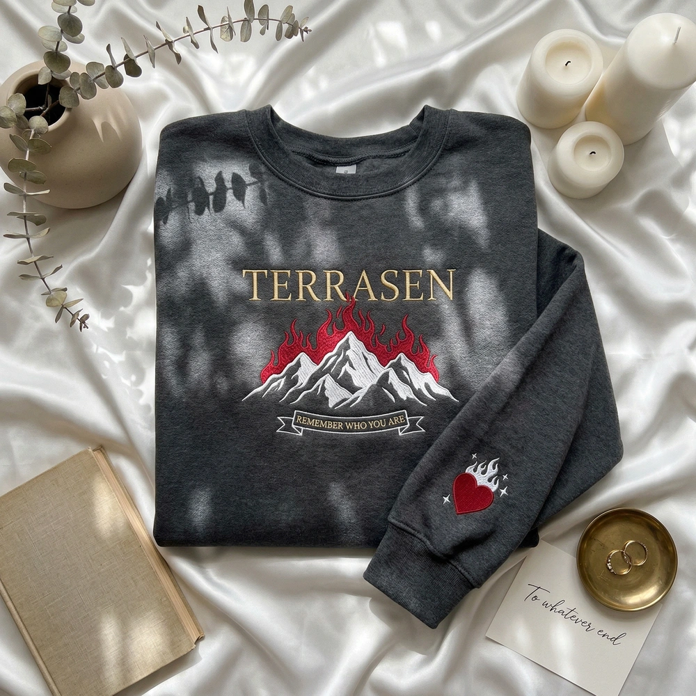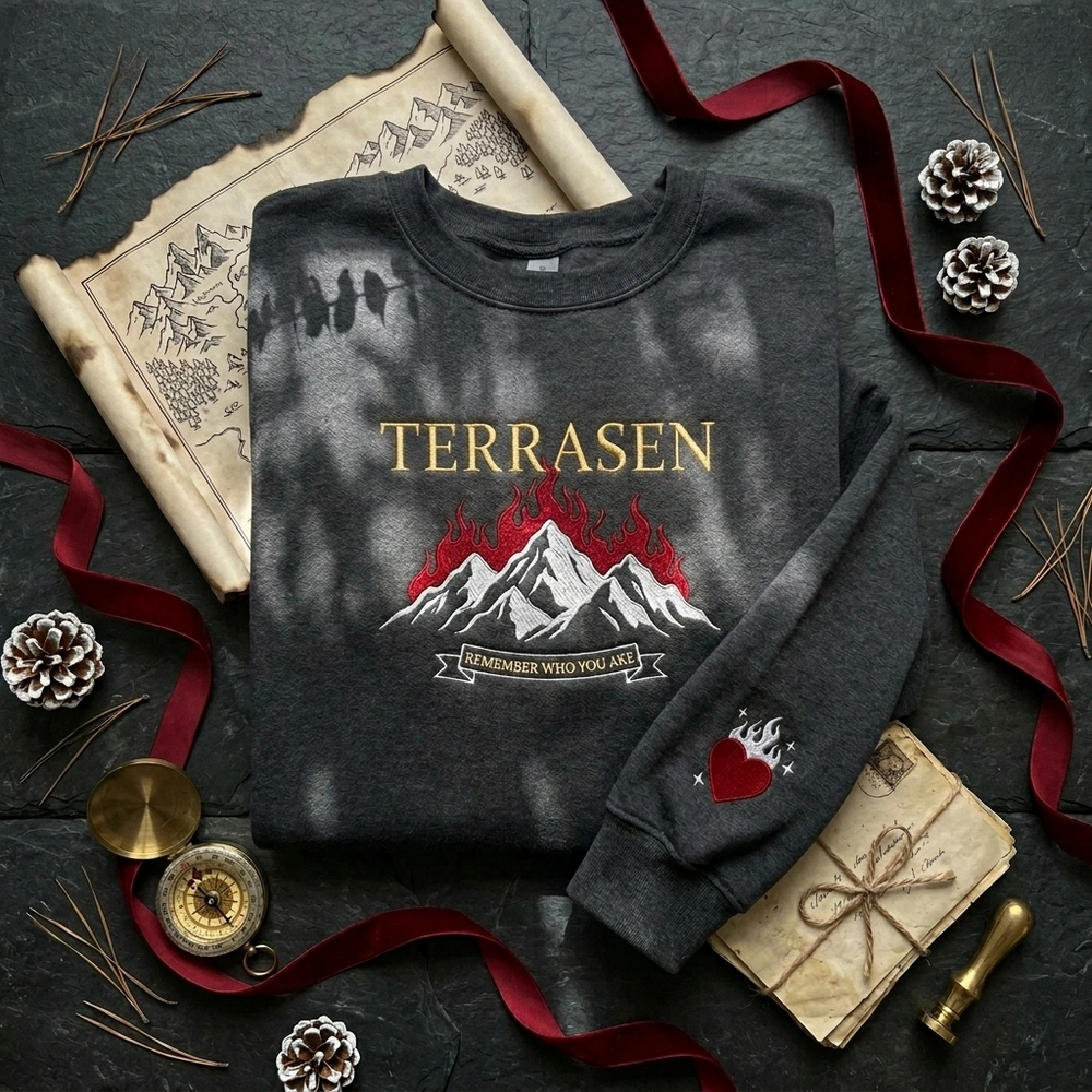 The Terrasen Embroidered Sweatshirt is a premium machine-embroidered garment featuring the majestic flaming mountains and the iconic “Remember who you are” quote ribbon. This piece is designed for those who find their home within the pages of epic fantasy and want to carry a piece of that magic with them every day.