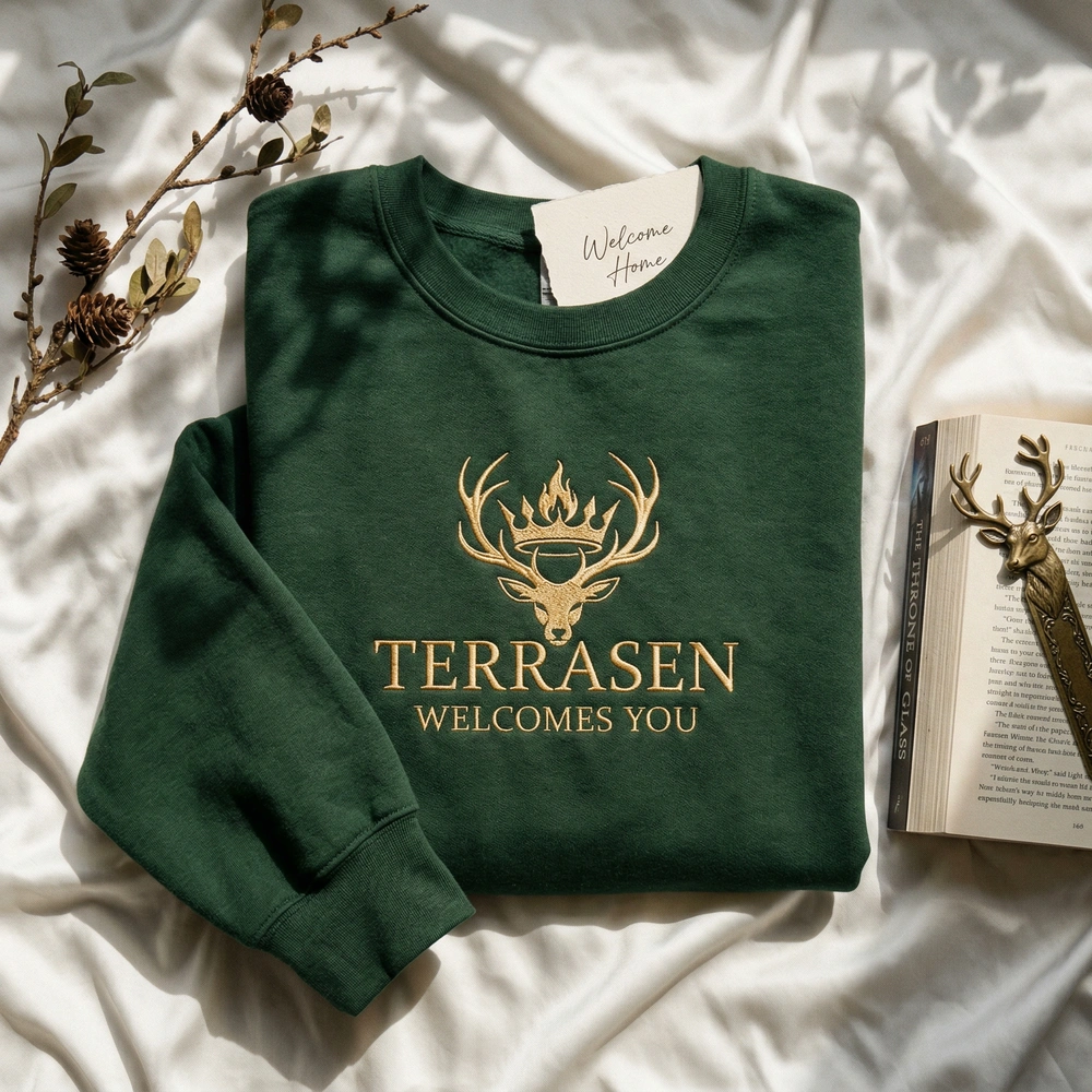 The Terrasen Embroidered Sweatshirt is a premium machine-embroidered top featuring the iconic stag crown motif, perfect for fantasy book readers.