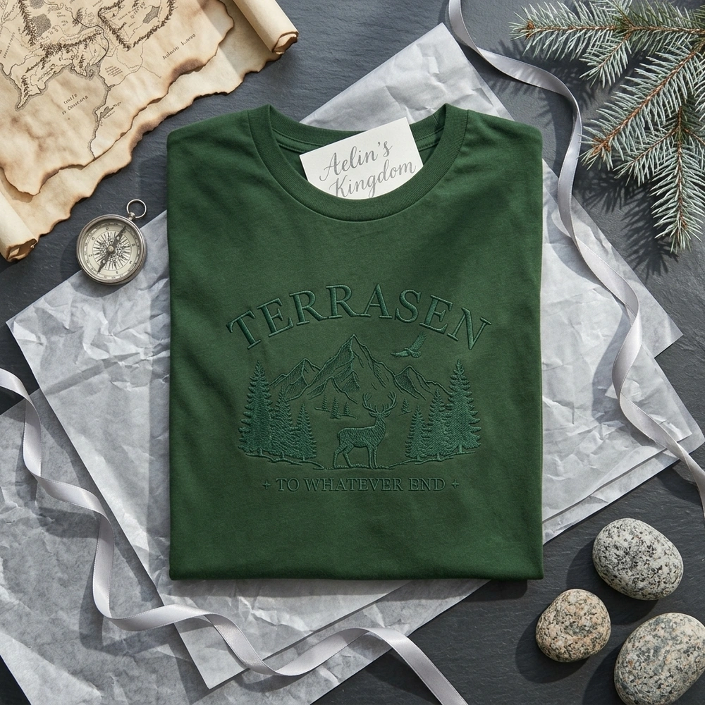 The Terrasen Embroidered Sweatshirt is a premium machine-stitched top featuring a detailed mountain landscape and the iconic ‘To Whatever End’ quote.