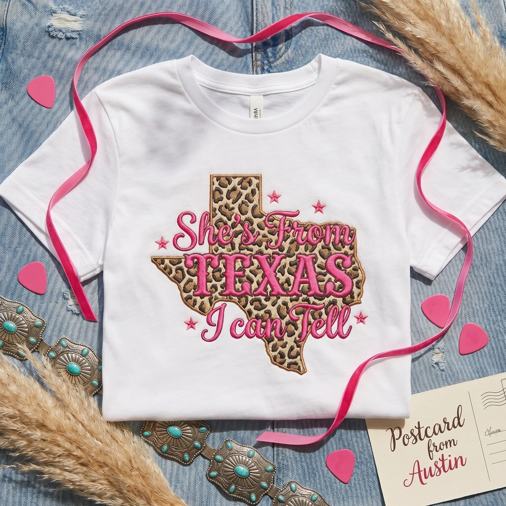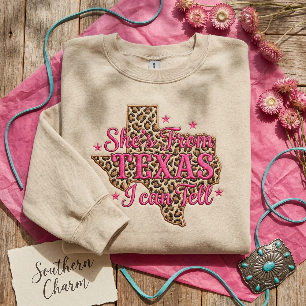 This exclusive design is meticulously crafted with over 20,000 stitches to ensure a premium, textured finish. The center-chest embroidery measures 25cm x 20cm and features a striking leopard print fill in the silhouette of Texas, utilizing high-quality threads in Saddle Brown, Tan, and Black. The bold “She’s From TEXAS I can Tell” typography pops in vibrant Hot Pink satin stitching, accented by retro Y2K-inspired sparkles and four-point stars. We use a soft, heavy-blend Cream/Sand garment that provides the perfect neutral canvas for the 4-color thread palette.