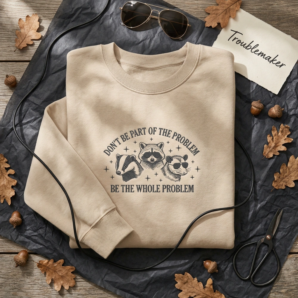 This center-chest embroidery design is rendered in a high-contrast charcoal grey thread (#36454F) against a warm sand-colored garment. The 22cm x 18cm design features a raccoon, an opossum, and a badger all wearing aviator sunglasses, with the central raccoon sporting tiny lightning bolt details on the lenses. We use intricate, layered running stitches and light fill patterns to create a sketched, illustrative texture that captures the chaotic fur of these woodland misfits without causing fabric puckering. The vintage arched serif typography reads ‘DON’T BE PART OF THE PROBLEM’ and ‘BE THE WHOLE PROBLEM’ for a complete grunge aesthetic.