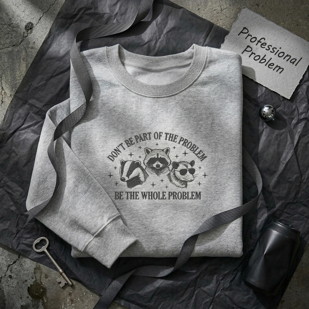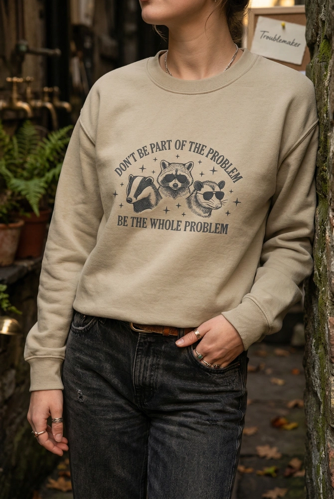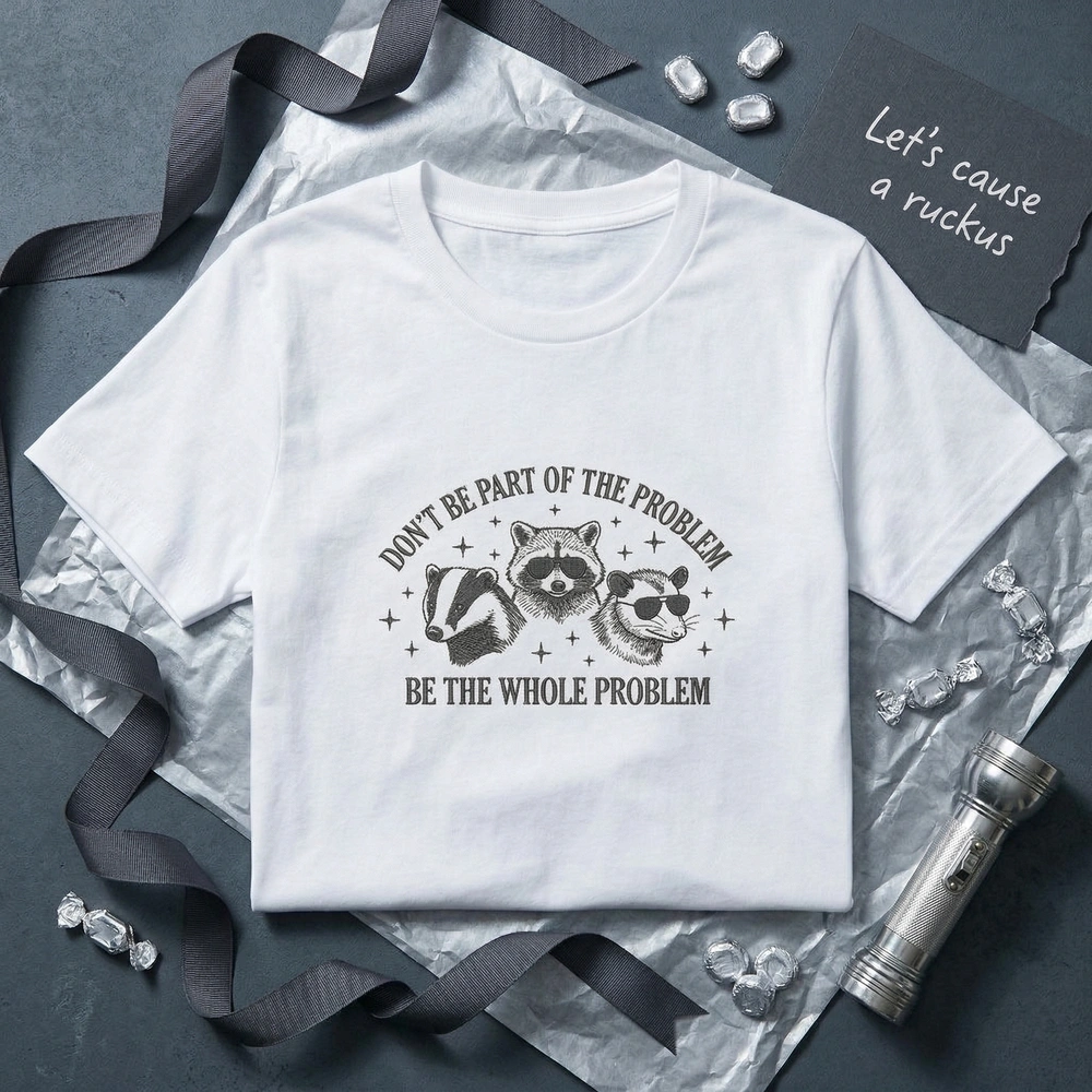 This design is inspired by the viral ‘trash panda’ internet subculture and the sarcastic ‘be the whole problem’ slogan that celebrates chaotic energy and ironic humor popular on social media.