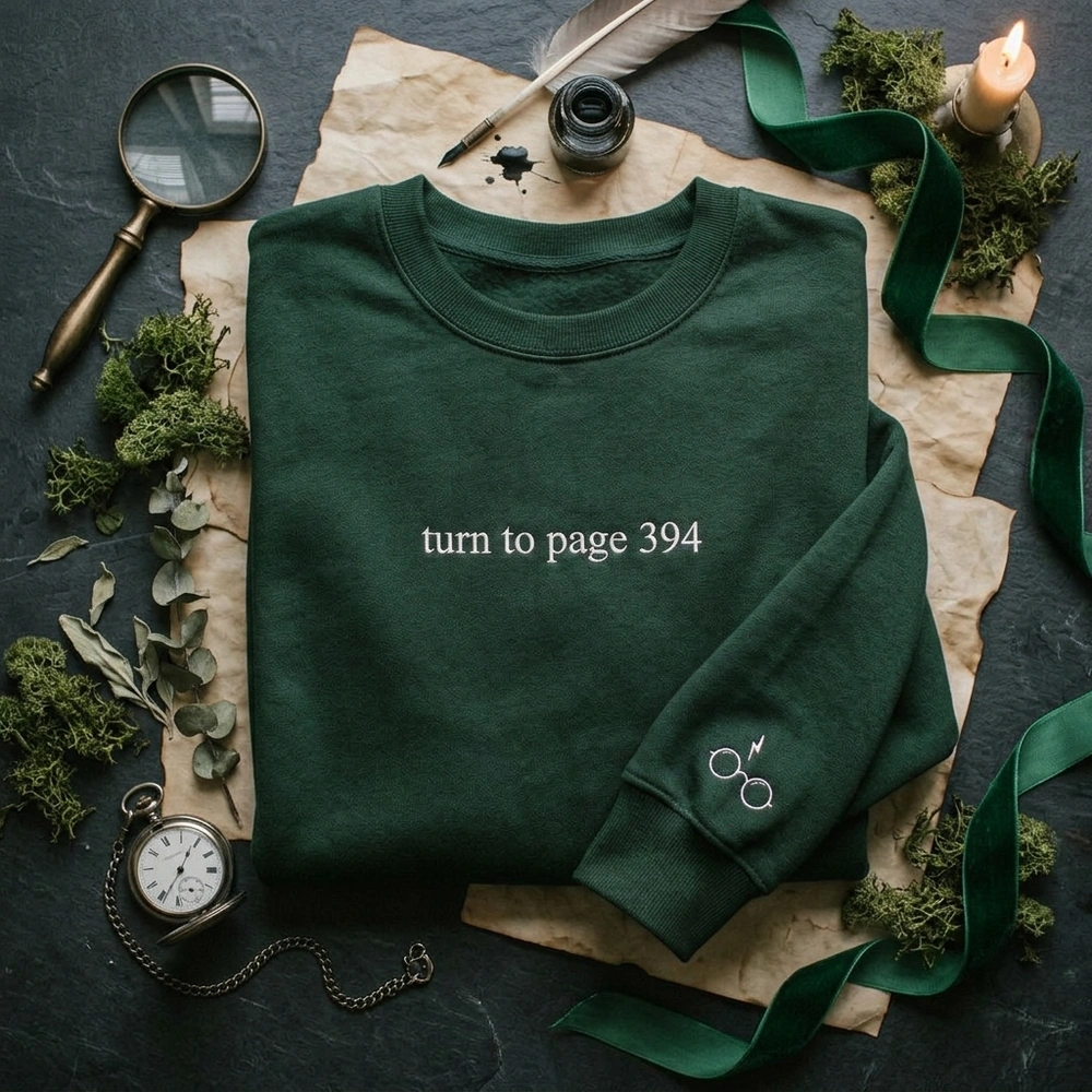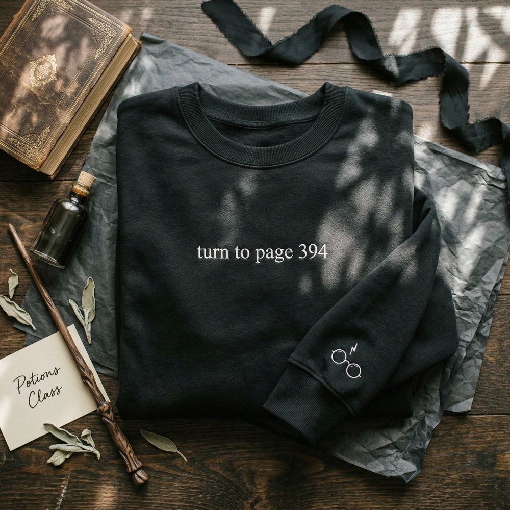 The Turn to Page 394 Embroidered Sweatshirt is a premium machine-stitched top featuring iconic bookish quotes and subtle wizard-inspired sleeve icons.