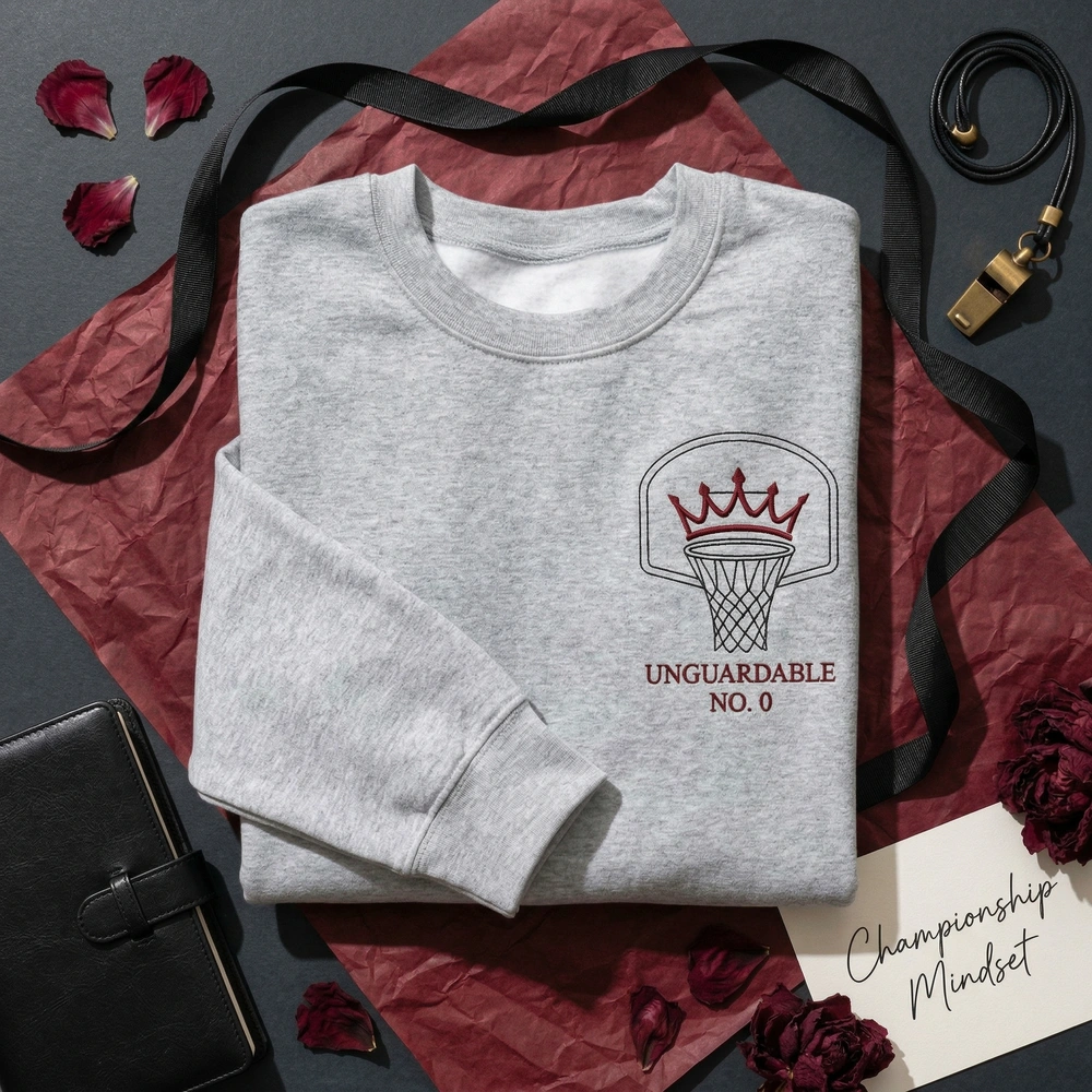 This exclusive design is precision-stitched on a premium white garment, ensuring both durability and a high-end feel. The left-chest placement measures approximately 8cm x 10cm and features a bold black basketball net topped with a regal queen’s crown in deep garnet red (#73000A). The crisp sans-serif text “UNGUARDABLE” and “NO. 0” are rendered in matching garnet thread, creating a striking contrast that honors the reigning queens of the court without shouting. We use high-sheen, 2-color embroidery thread to ensure the design remains vibrant through every wash.