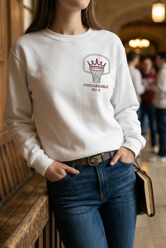 The Unguardable No 0 Embroidered Sweatshirt features a minimalist basketball crown design, offering a sophisticated way for fans to celebrate elite college hoops.
