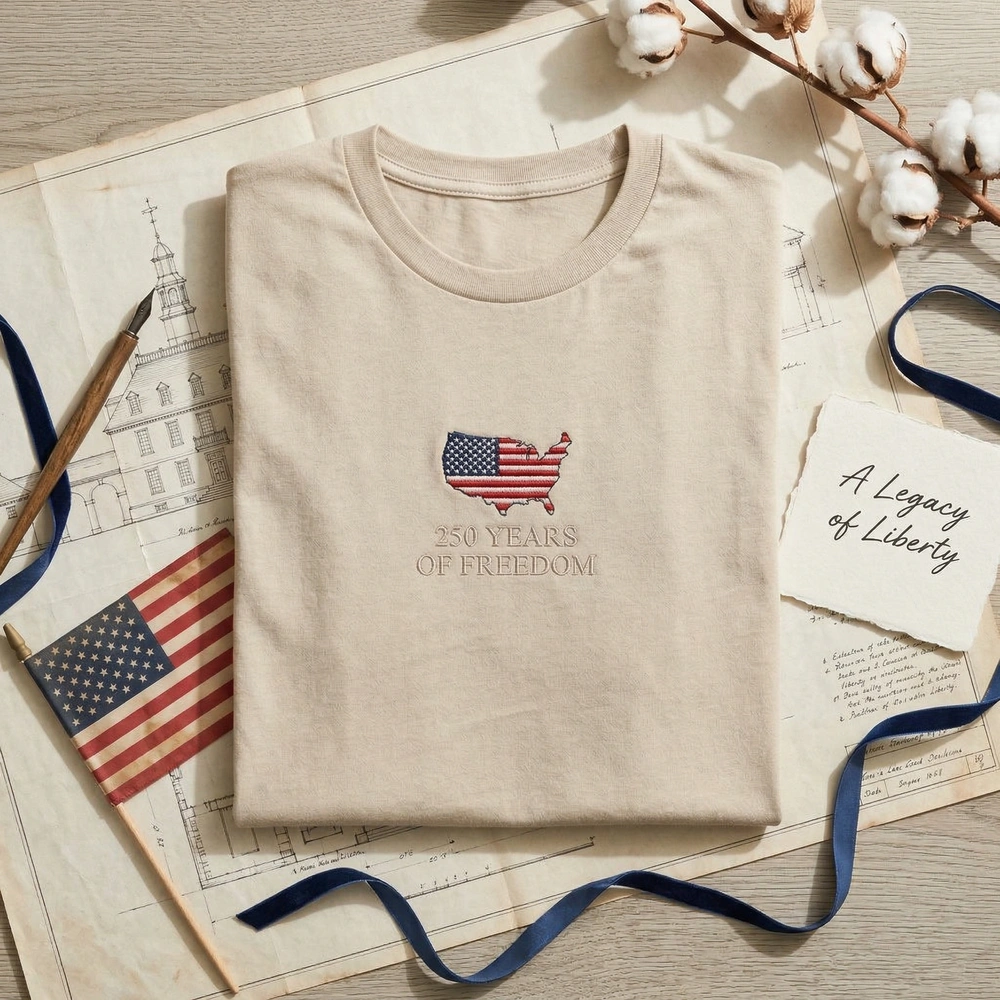 This design features a minimalist center-chest composition on a True Navy garment. The focal point is a 5cm wide miniature silhouette map of the United States, meticulously rendered with a dense fill stitch depicting the stars and stripes in crimson red, bright white, and old glory blue. Directly beneath the map, the phrase ‘250 YEARS OF FREEDOM’ is executed in a light beige satin stitch. This premium typography spans 20cm in width, providing a raised texture and excellent legibility. The 4-color thread palette ensures maximum durability and a timeless boutique aesthetic.