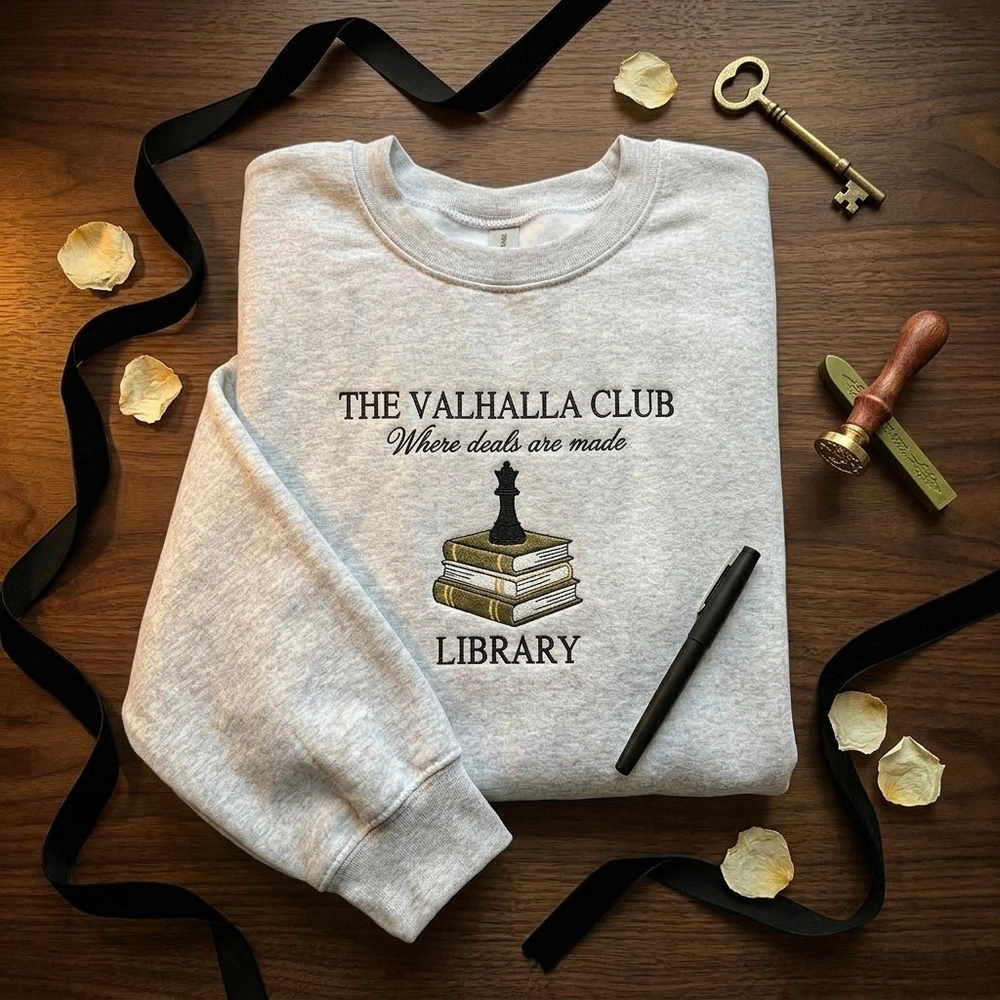 The Valhalla Club Embroidered Sweatshirt is a premium machine-embroidered top featuring a detailed book stack and chess queen design for dark romance fans.