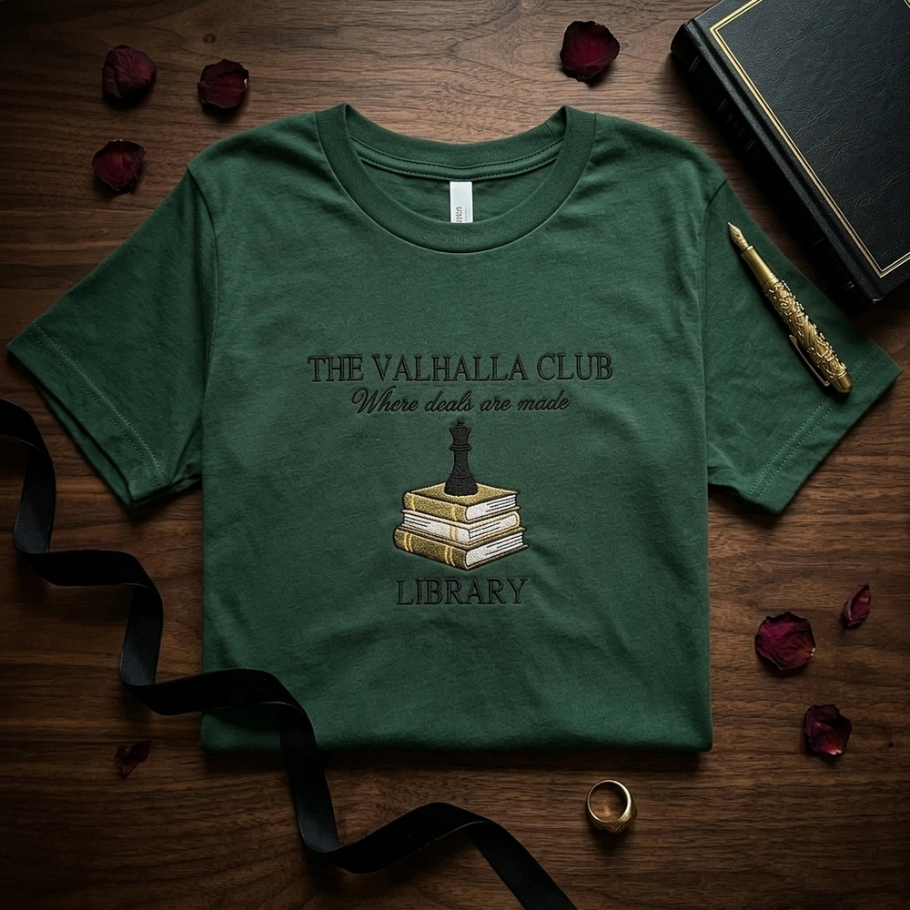 This design is meticulously crafted with 4 high-quality thread colors, including Olive Green, Gold, White, and Black. The center-chest embroidery measures approximately 10cm x 12cm and features the bold “THE VALHALLA CLUB” serif typography paired with an elegant script reading “Where deals are made.” The central graphic showcases three stacked books with detailed green and white spines, topped with a solid black chess queen piece—a significant symbol for fans of the billionaire romance genre. The design is perfectly showcased on a Light Heather Grey garment for a clean, academic aesthetic.
