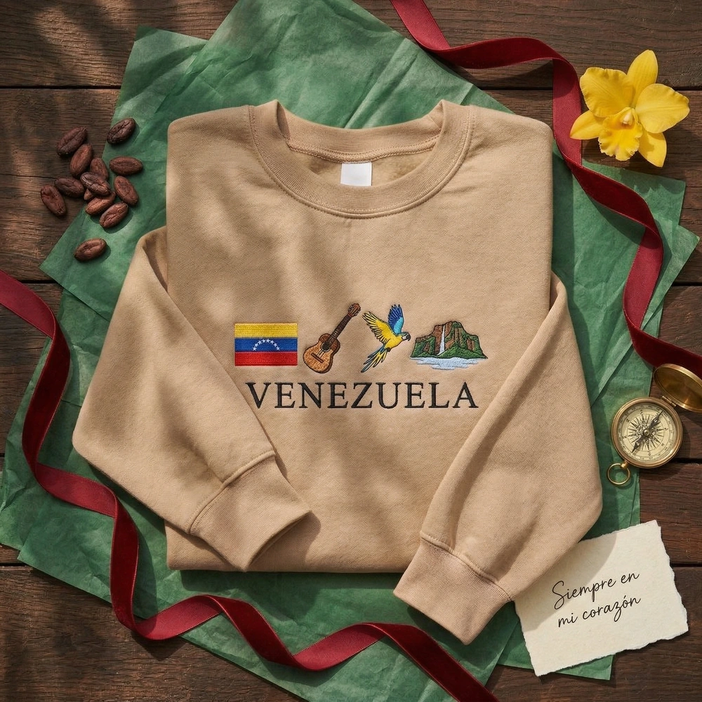 The Venezuela Embroidered Sweatshirt is a premium machine-embroidered garment featuring the Venezuelan flag, Salto Angel, and a Guacamaya — perfect for expats.