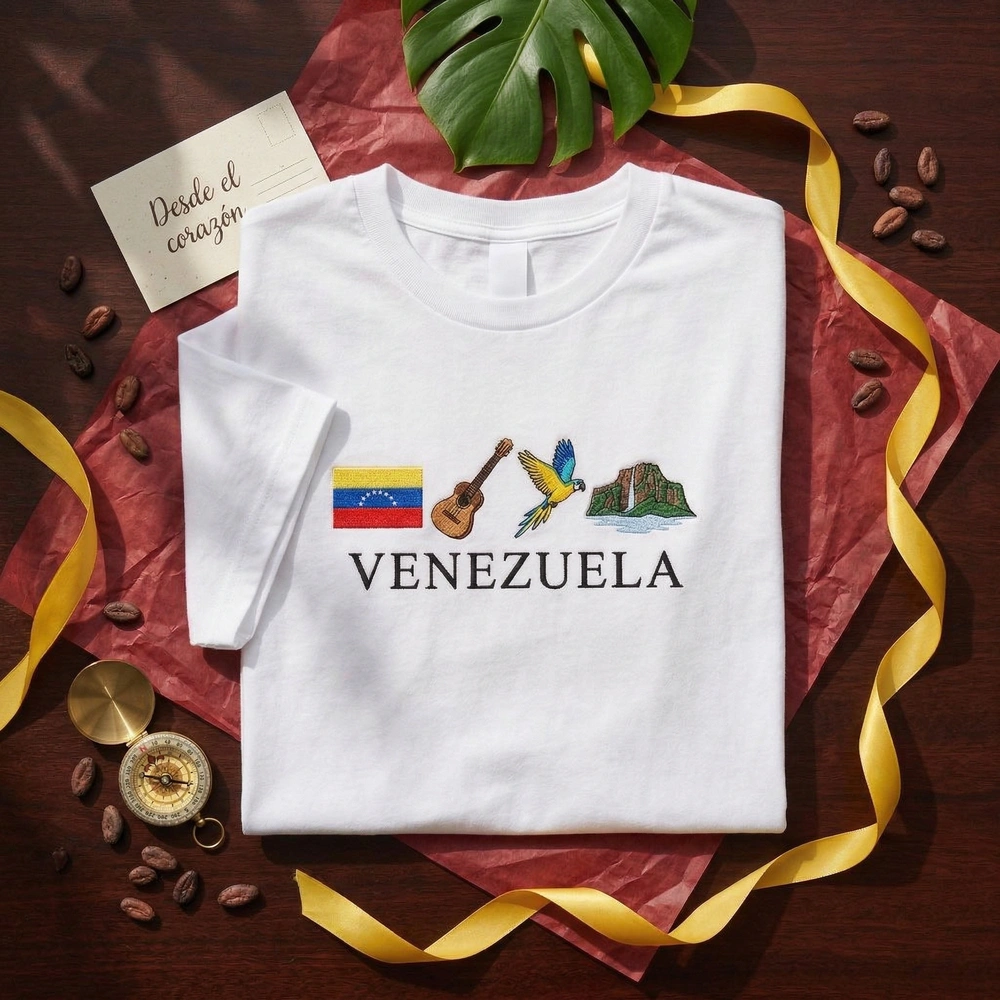 This original design features a horizontal linear composition measuring 12cm x 5cm, centered perfectly on a soft Light Pink garment. We use 8 distinct high-quality thread colors, including Venezuelan Yellow (#FFCC00), Blue (#00247D), and Red (#CF142B). The embroidery utilizes high-density fill stitches for the tricolor flag and the lush greenery of the Salto Ángel tepui, while the “VENEZUELA” serif text and the delicate strings of the Cuatro guitar are rendered in precise satin stitching for a professional, textured finish.