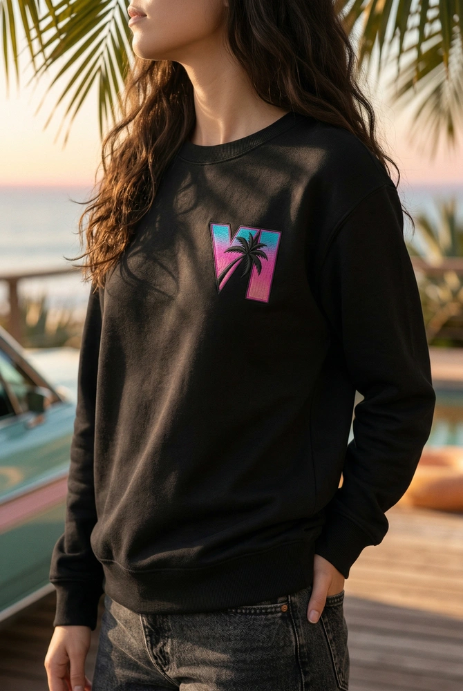 This Vice City Embroidered Sweatshirt features a minimalist VI logo with a neon sunset gradient, perfect for fans of the GTA 6 aesthetic and gaming.