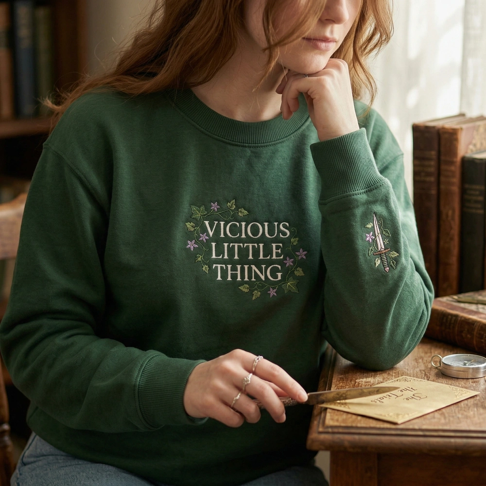 This design is expertly crafted using a three-color thread palette of crisp white, deep forest green, and delicate purple. The center chest (20cm x 10cm) features the quote “VICIOUS LITTLE THING” in a classic serif font, woven through with green ivy and star-shaped flowers. The left sleeve (5cm x 12cm) showcases a matching embroidered dagger wrapped in leaves, tying the dangerous and delicate themes together. Every stitch is placed on a heavy-blend Forest Green sweatshirt for maximum durability and comfort.