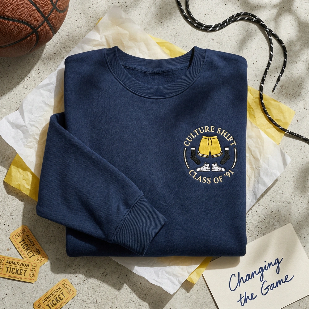 This exclusive design is meticulously rendered as a 9cm x 9cm left-chest emblem. The motif features a stylized pair of oversized #FFCB05 maize-yellow basketball shorts hovering above classic black crew socks and white retro sneakers. Framed by a circular athletic badge with clean collegiate typography, the design uses minimal stitch density to ensure the navy blue sweatshirt maintains a comfortable, soft drape. We use three vibrant thread colors to bring this 1991 basketball apparel to life without the bulk of traditional heavy embroidery.