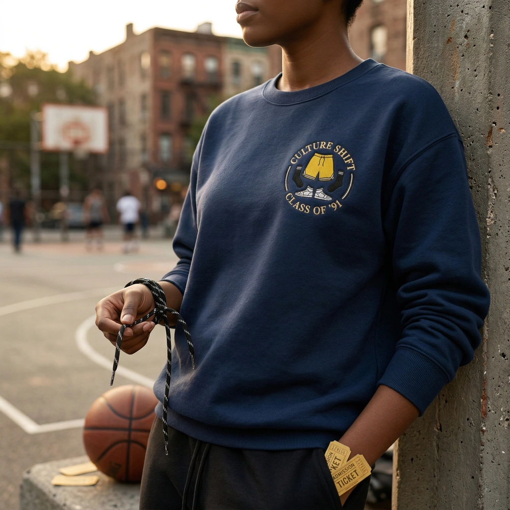 The Vintage 90s Basketball Embroidered Sweatshirt features a premium Culture Shift 91 emblem, capturing the era of baggy shorts and black socks.