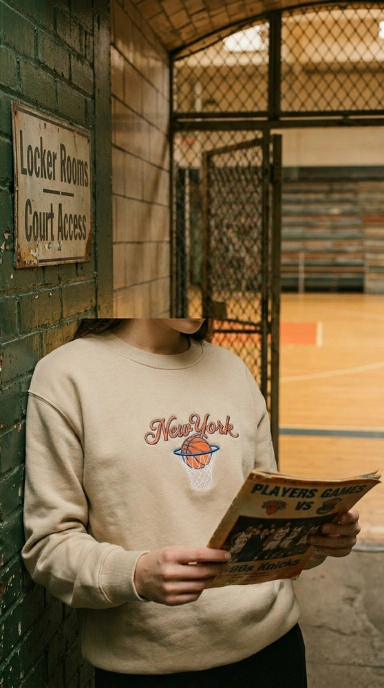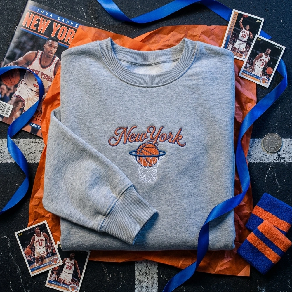 Relive the golden era of Madison Square Garden with this authentic throwback piece. Designed for those who bleed orange and blue, this sweatshirt captures the grit and glory of the 1994 basketball season. Whether you are heading to the arena or styling a streetwear look, this garment offers that rare thrift-store find aesthetic without the wear and tear. Browse more embroidered sweatshirts in our collection to find your perfect match.